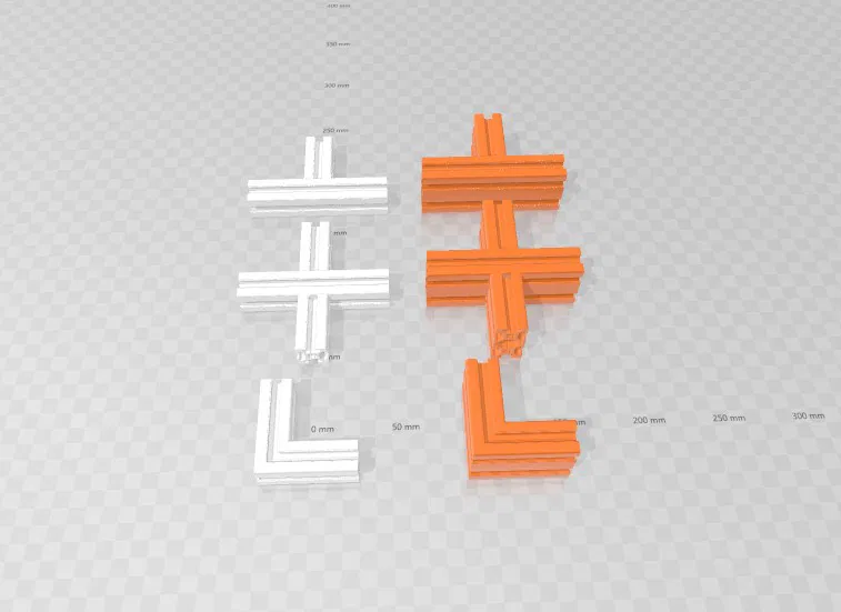 Một hệ thống thanh nhôm định hình 2020/2040 in 3D, với các khớp nối bên trong giúp khe rảnh thông thoáng. Thích hợp làm khung bao hoặc khung phụ trợ, không chịu lực trực tiếp. Tối ưu hướng in và vật liệu PLA để đạt độ bền cao.