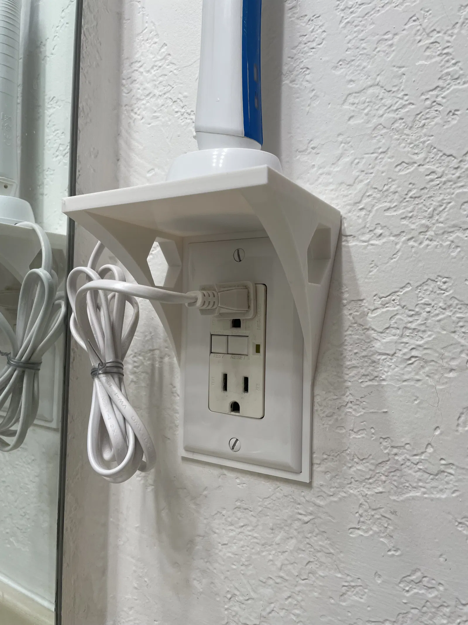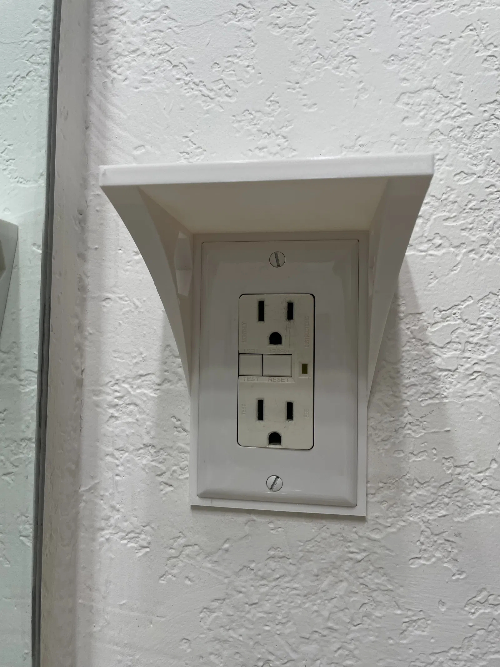Dọn dẹp bàn rửa mặt với kệ gắn ổ cắm điện. Tận dụng mặt ổ cắm GFCI có sẵn (2.75" x 4.50") để cố định kệ. Kệ có kích thước 4.00" x 3.00". Đã thêm tùy chọn cho mặt ổ cắm tiêu chuẩn.