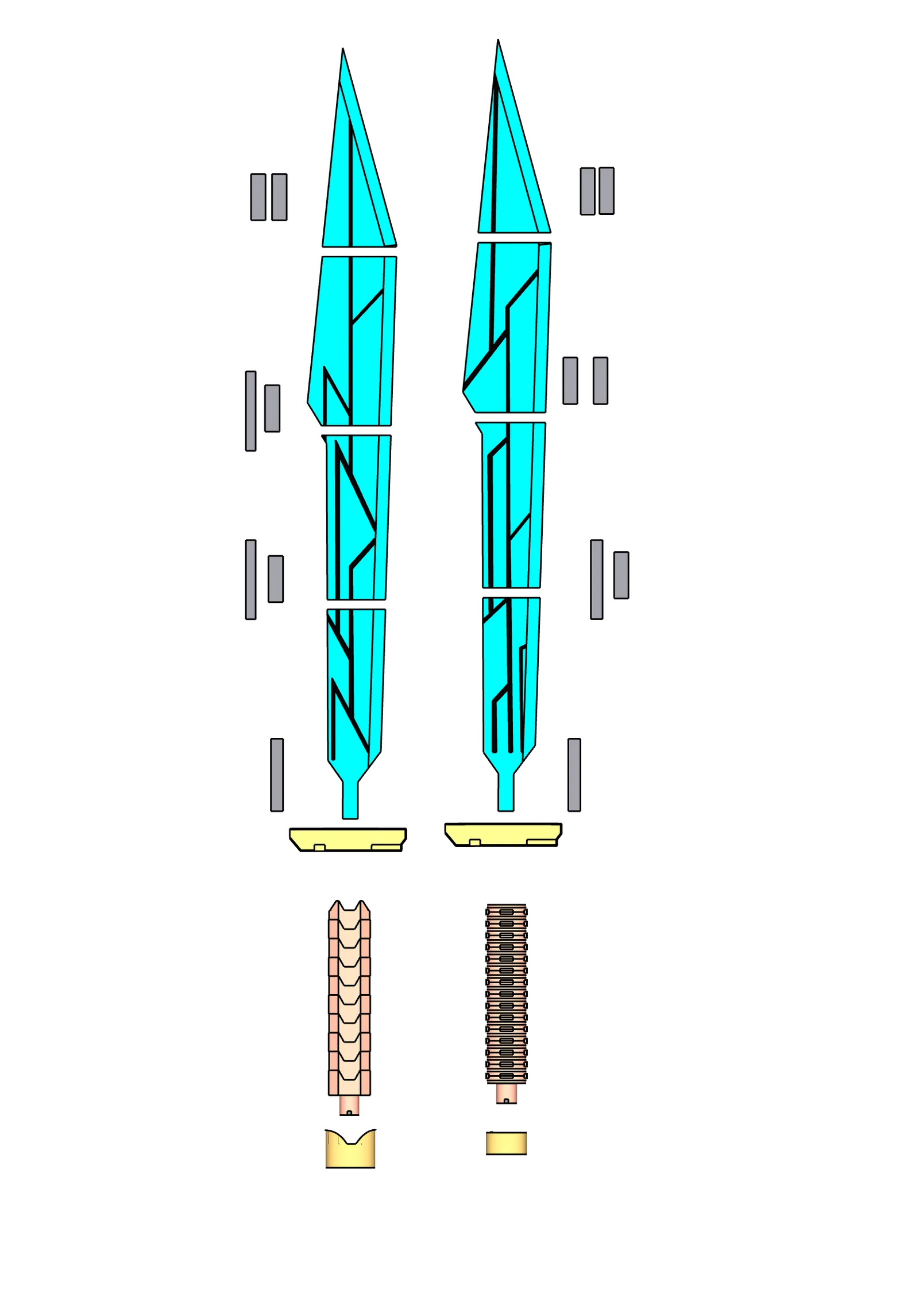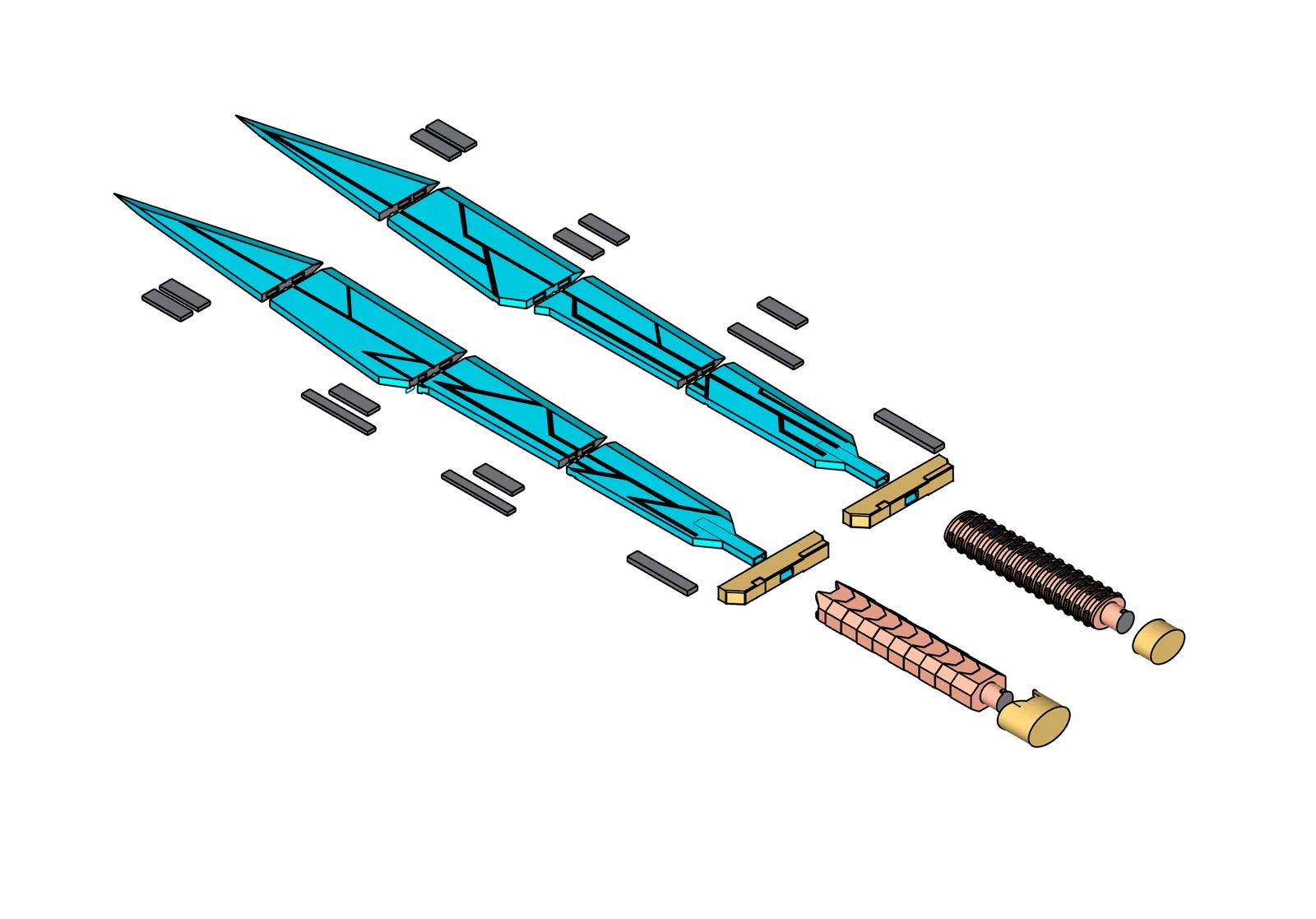Thiết kế này tui làm mất đâu cỡ hai tuần mới xong. Cả hai thanh kiếm là phiên bản xấp xỉ nhất theo tui thấy về thanh kiếm mà Thor đã xài trong cảnh đấu với Hulk ở đấu trường. Kiếm thật dài 0.9m (3ft) và kiếm tui làm cũng cỡ 3ft luôn. Cả hai thanh kiếm đều có những đường chạy dọc lưỡi kiếm, khớp với mấy cái phần tương ứng của nó, giúp cho mấy chỗ nối lại dễ hình dung hơn. Chúng đều có các miếng nối, tất cả đều cùng kích thước ngoại trừ 3 miếng dài, 3 miếng đó thì lại bằng nhau. Tôi có cung cấp bản vẽ PDF cho cả hai thanh kiếm nếu cần để dễ hiểu hơn.