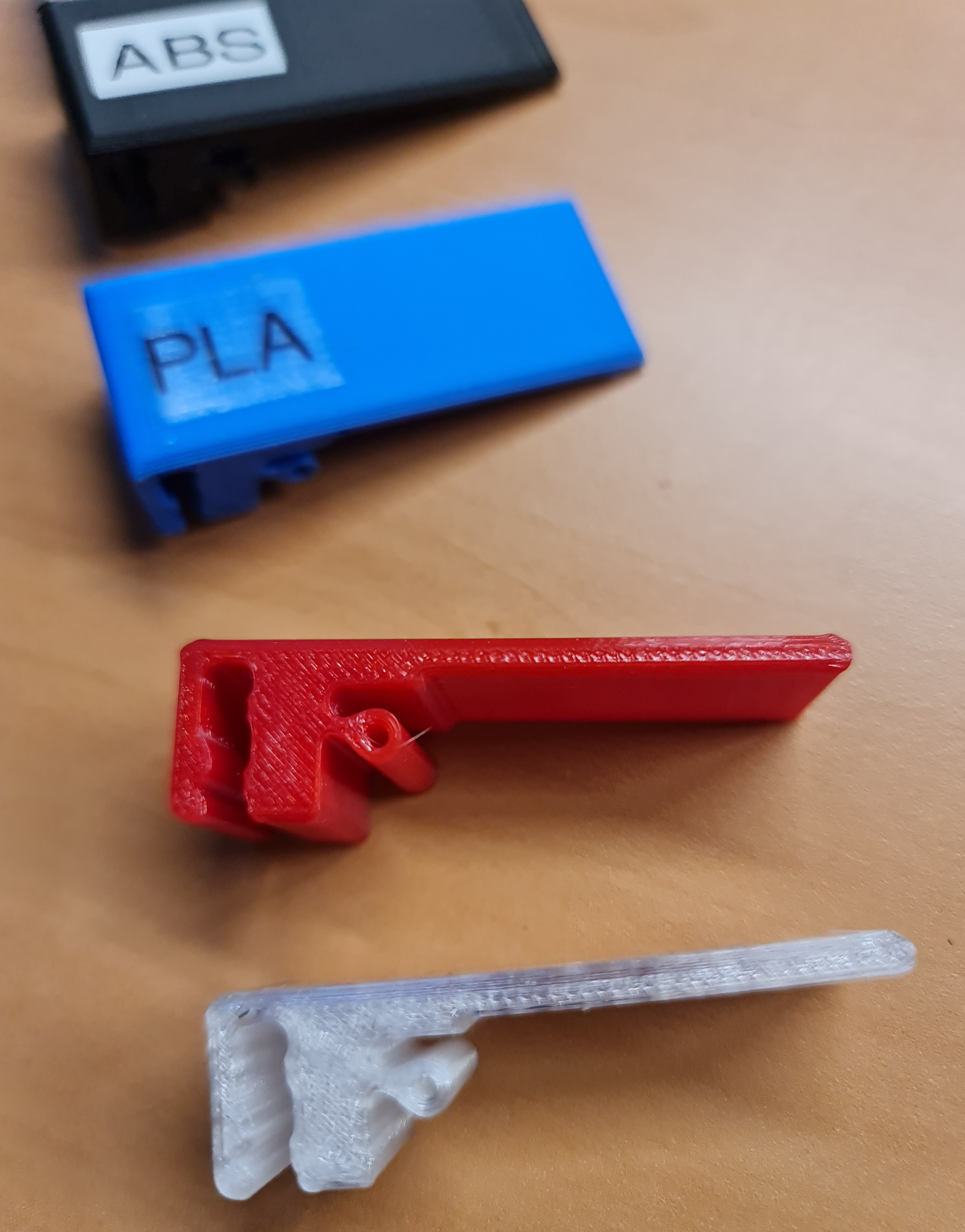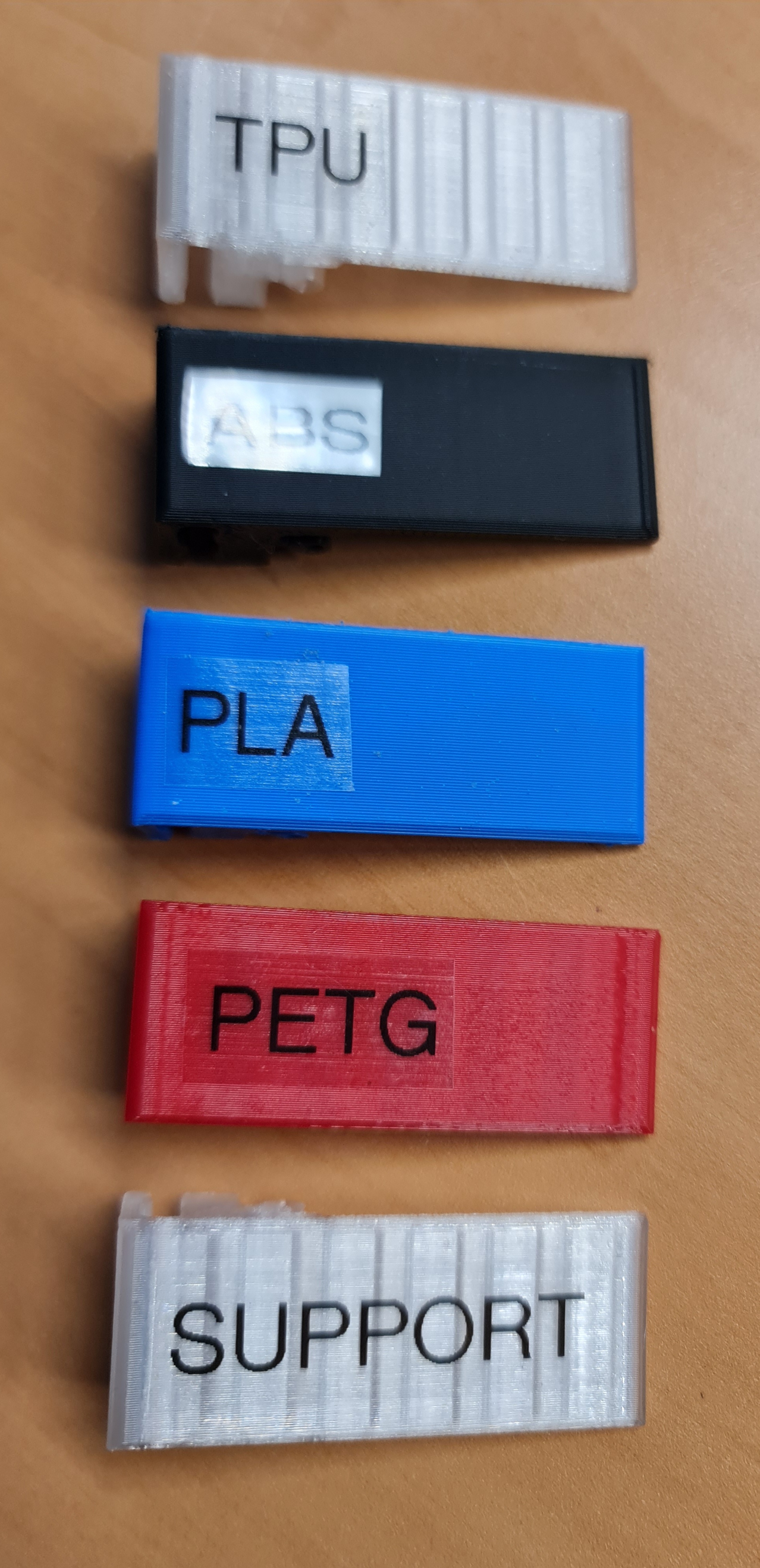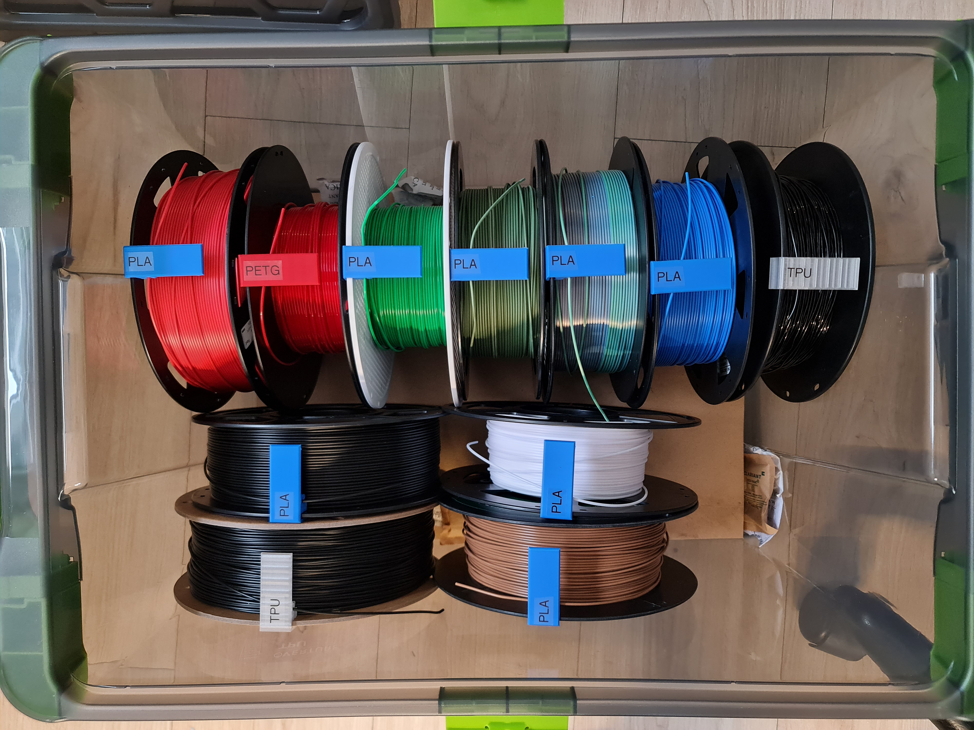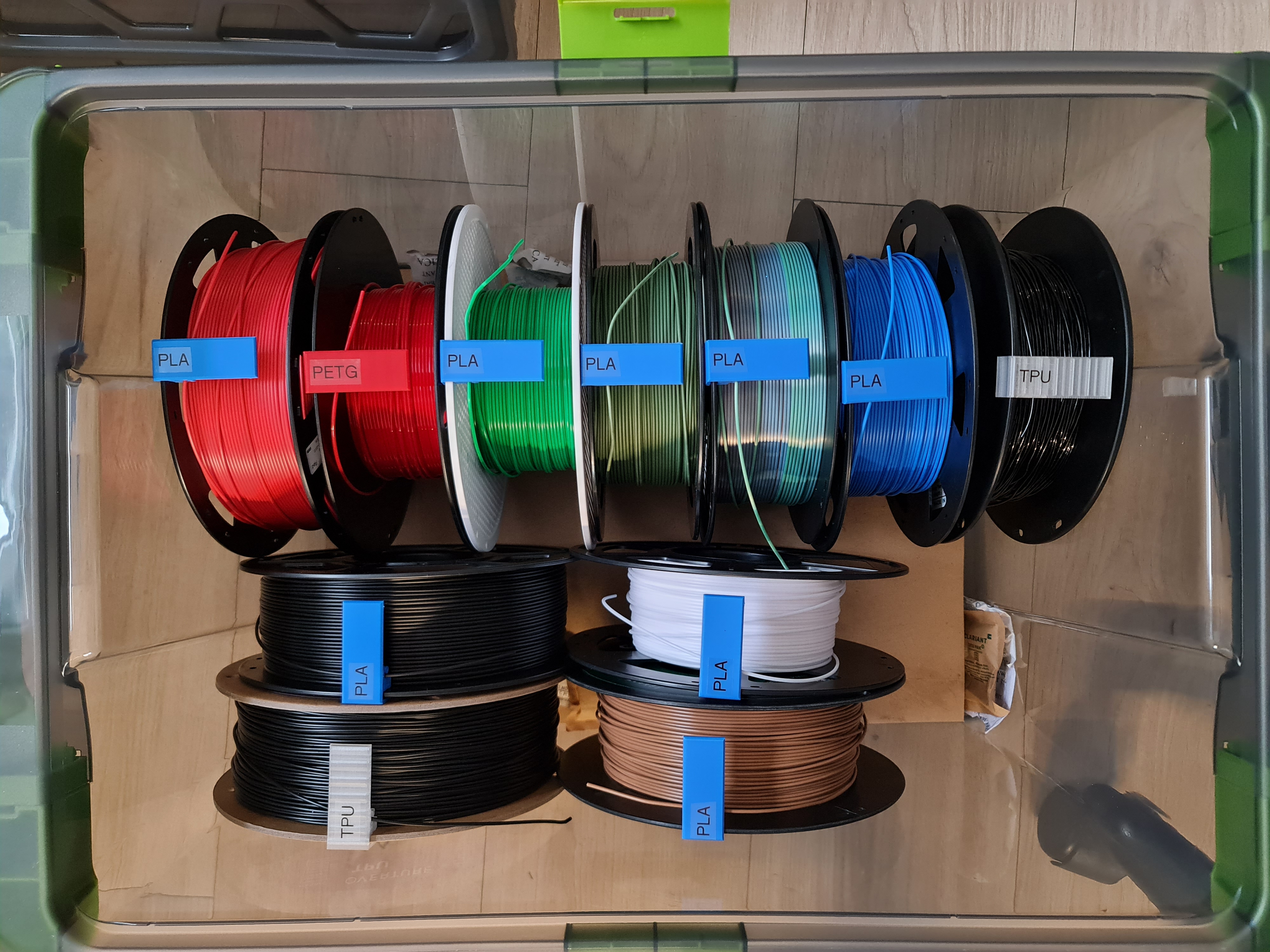 Phần đế giữ các kẹp được gắn bằng băng keo hai mặt lên AMS. Các kẹp này dùng để giữ sợi filament trên cuộn và dán nhãn. Chữ dán nhãn được in bằng máy Brother P-Touch, giúp dễ dàng thay đổi tên.