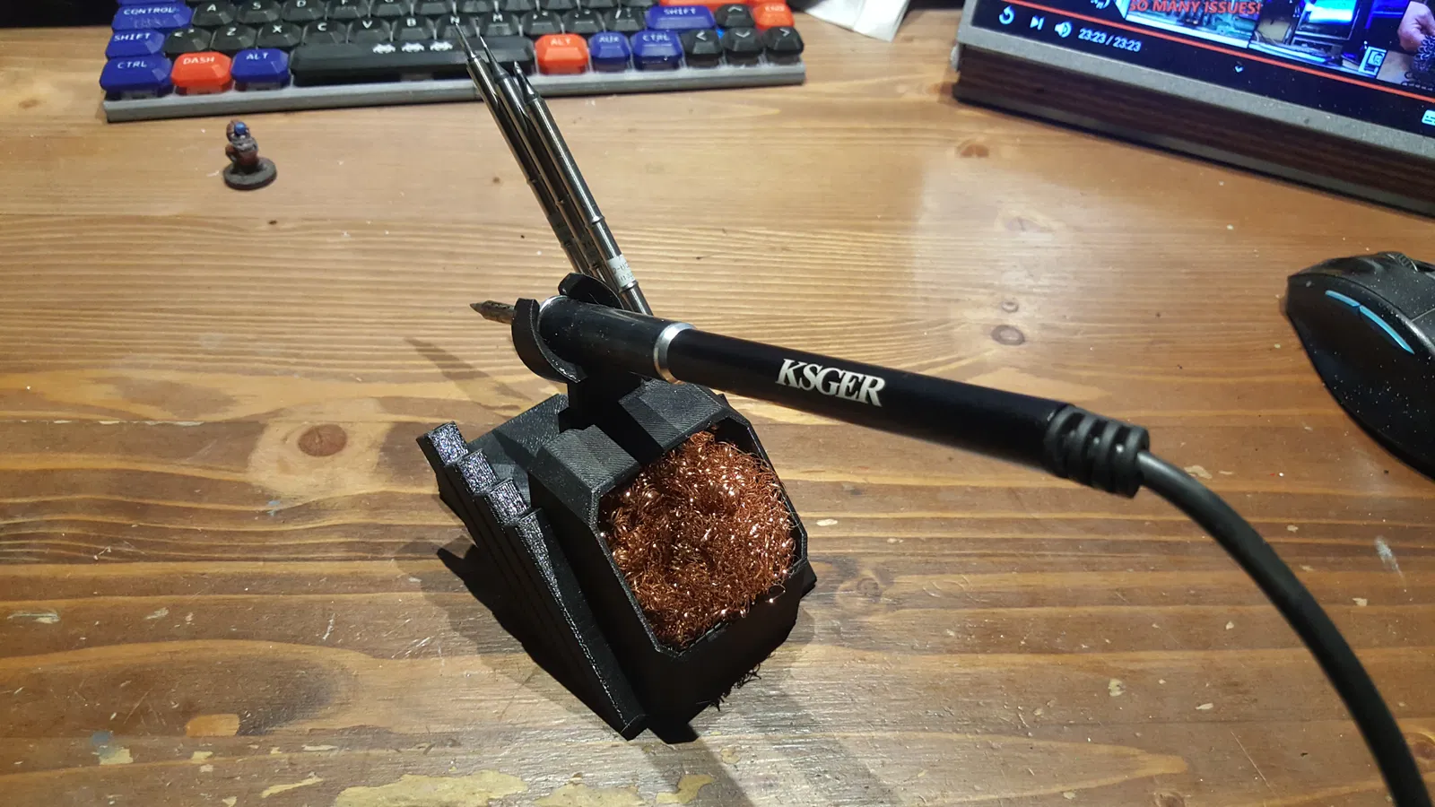 Cái đế đơn giản cho trạm hàn T12 rẻ tiền trên aliexpress, có chỗ để cọ rửa thiếc và giữ đầu hàn.