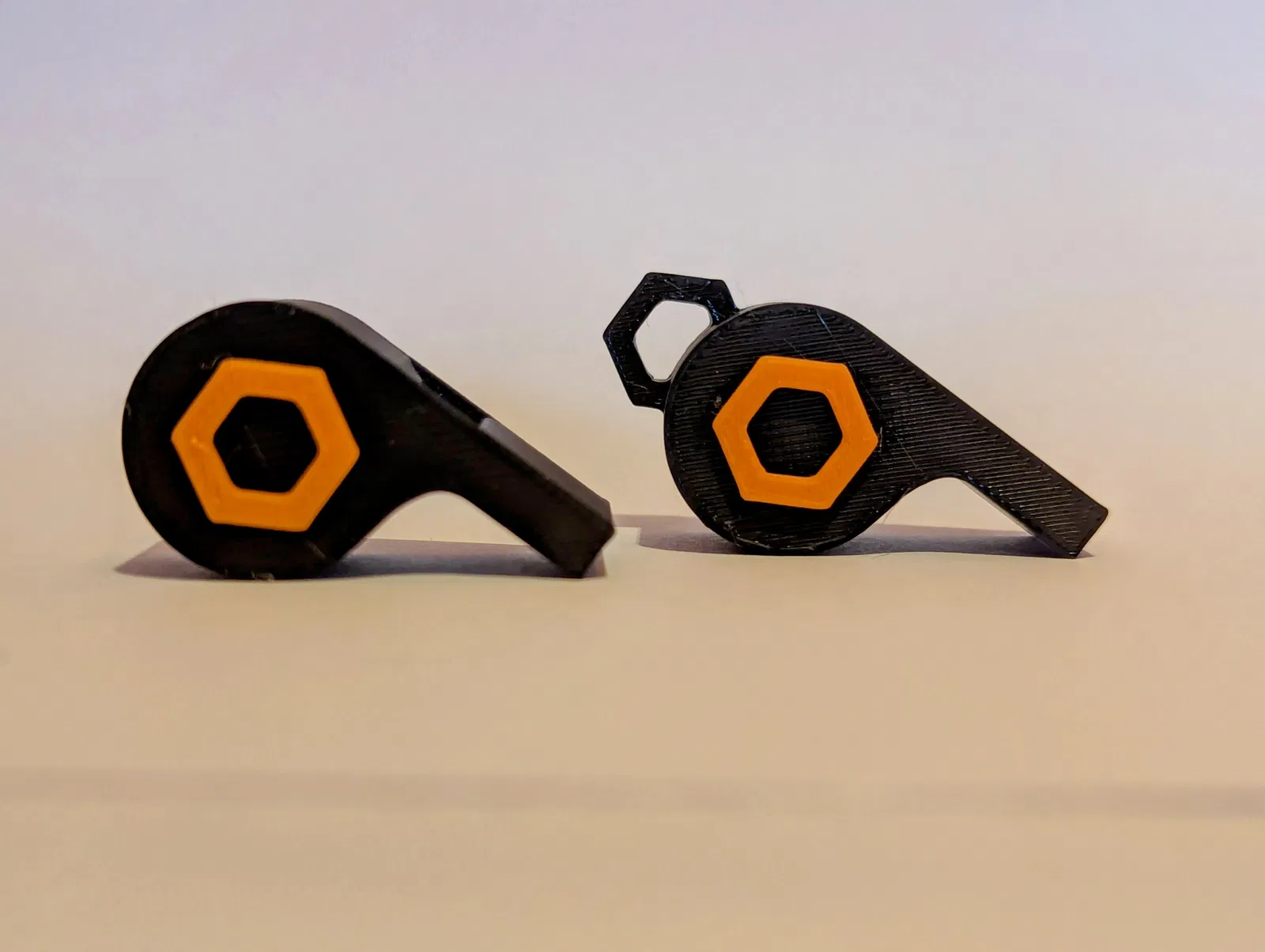 Mô hình còi Hexagon Whistle này có hai phiên bản: một loại có lỗ treo móc khóa và một loại không có. Điểm cộng lớn là bạn có thể in trực tiếp mà không cần dùng đến support, giúp tiết kiệm thời gian và vật liệu in ấn.