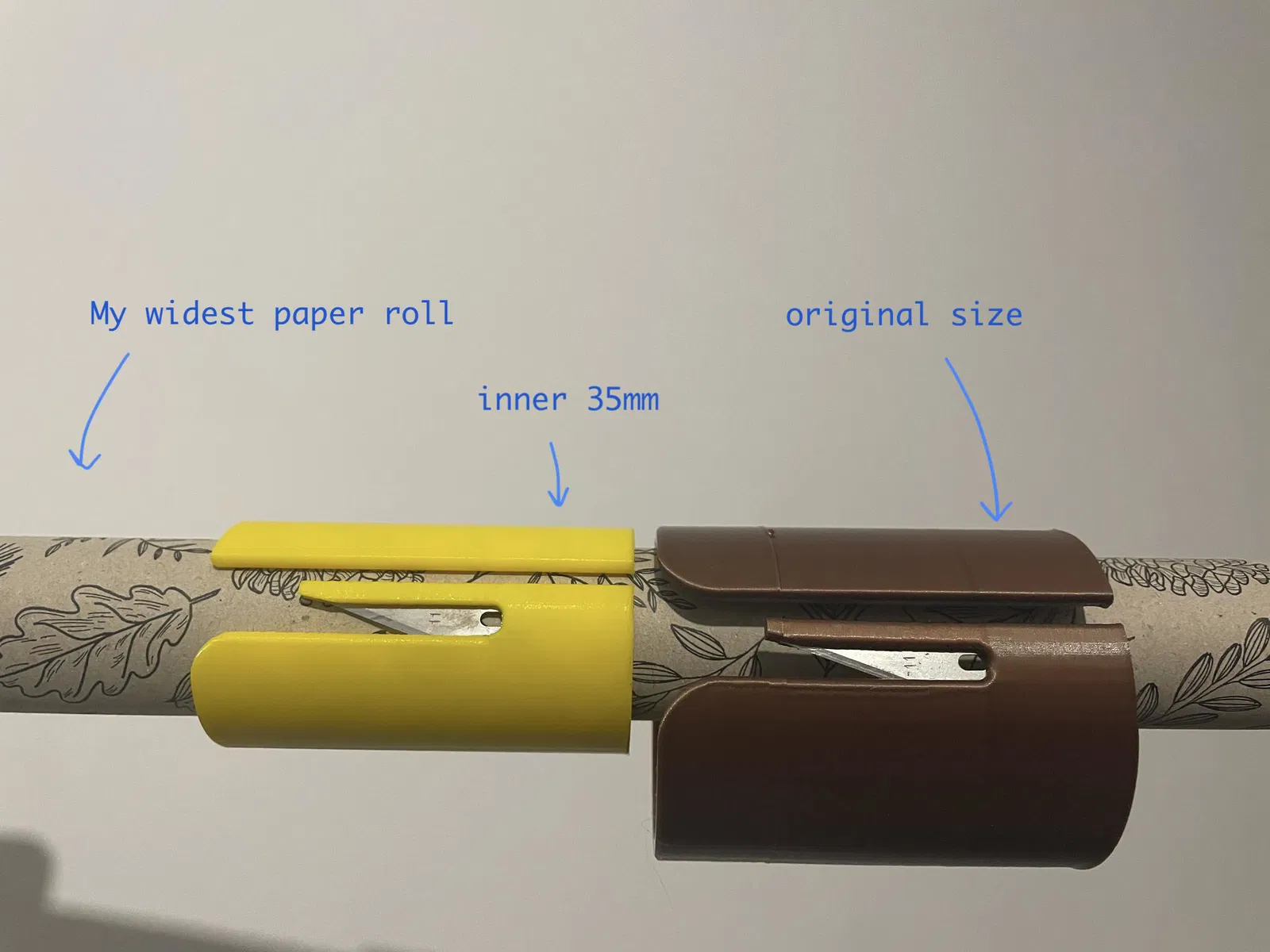 Tui mới làm bản nhỏ hơn cho cái dụng cụ cắt giấy gói, bản gốc to quá làm nhìn cục mịch trên cuộn giấy mỏng của tui. Sửa điểm yếu lúc in thì để bản sau làm tiếp hen!