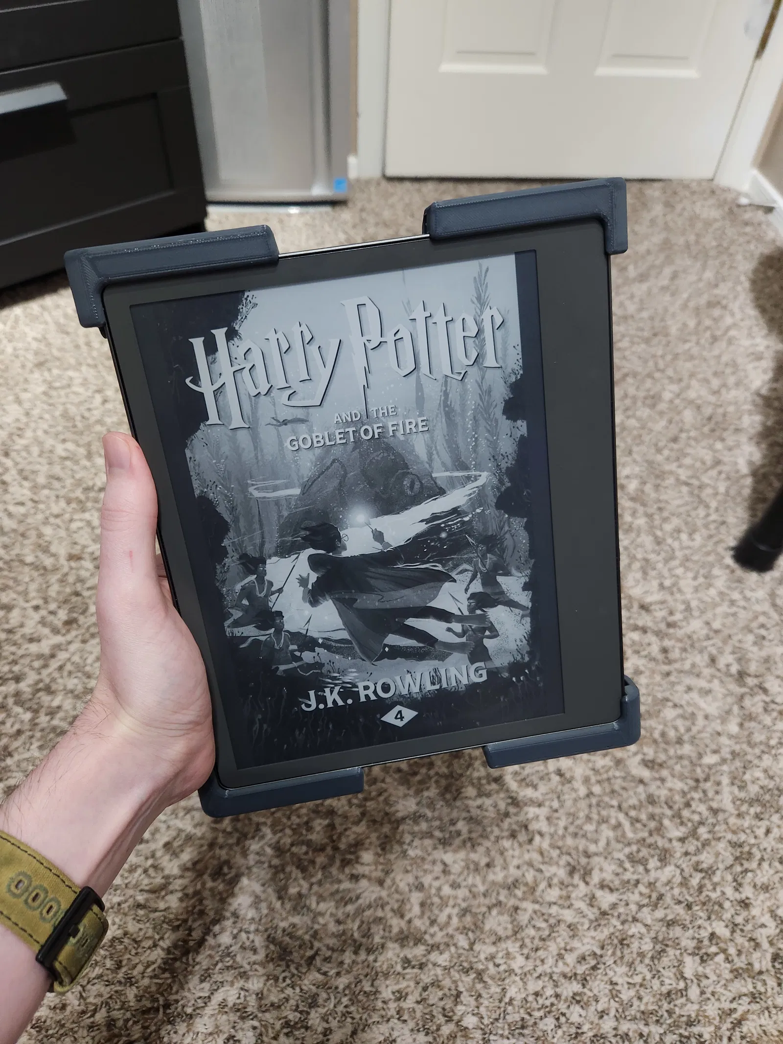 Cái vỏ này sẽ giúp bạn cầm Kindle Scribe chắc chắn hơn khi đọc sách. Bạn có thể cầm theo bất kỳ hướng nào, kể cả úp mặt xuống, và vỏ sẽ giữ chắc chắn, đồng thời cung cấp các vòng giữ ngón tay để bạn cầm Kindle. Vỏ có thể in bằng nhựa PLA. Hãy nhớ in các miếng đệm bằng TPU, điều này sẽ giúp ngăn đầu đọc bị rung lắc trong vỏ. Các miếng đệm TPU gắn vào phần gân giữa Kindle và vỏ.