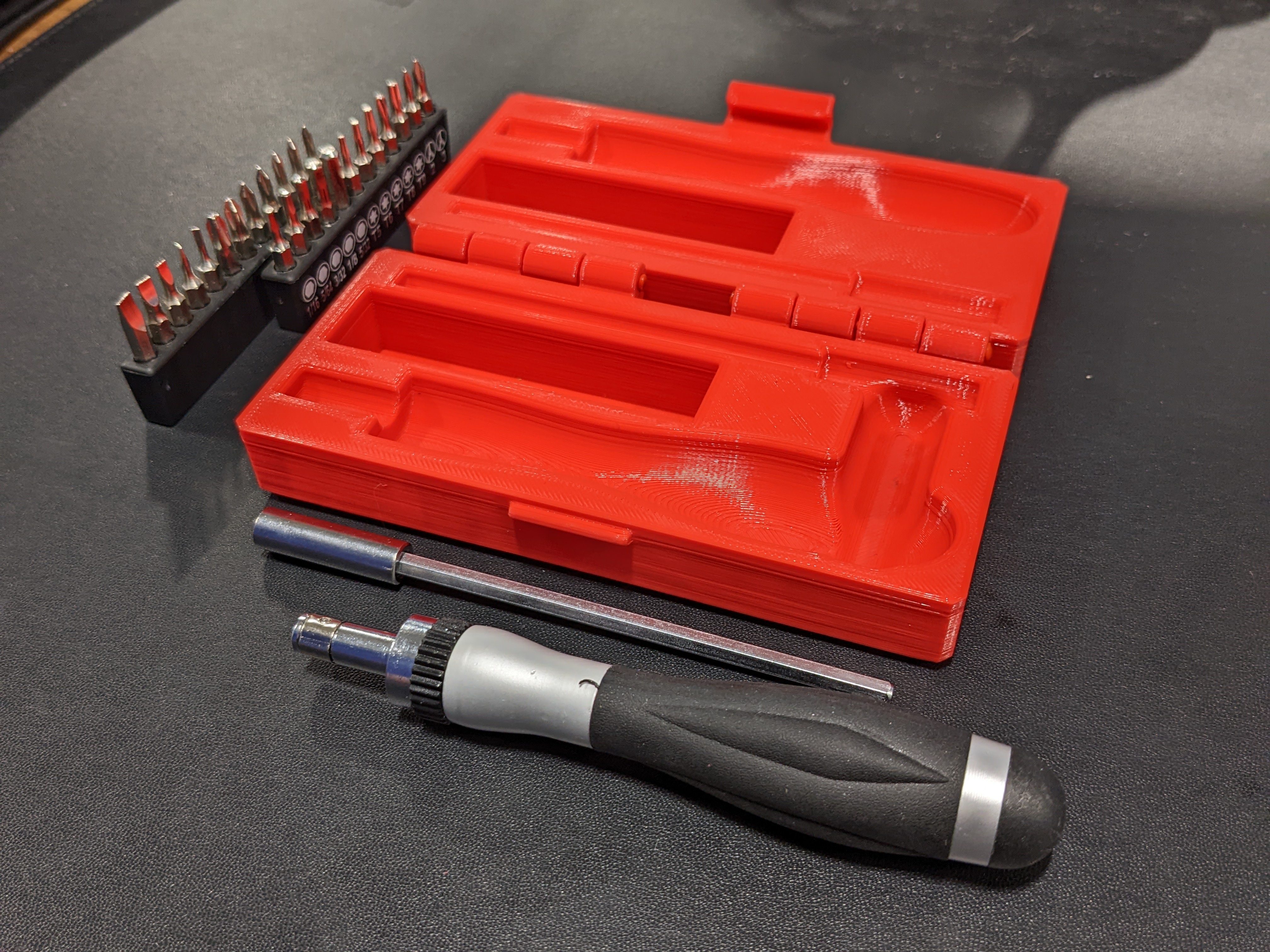 Tôi có mua một bộ tua-vít chính xác giá rẻ để dùng ở chỗ làm khi cần tháo các ốc nhỏ. Nhưng nó không đi kèm hộp đựng. Tôi cũng muốn thực hành chút với Onshape nên đã thiết kế cái này. Ban đầu, tôi sắp xếp các bộ phận riêng lẻ trên bàn theo ý mình muốn đặt trong hộp. Sau đó, tôi chụp một bức ảnh từ trên xuống. Tôi đưa ảnh đó vào Onshape, chỉnh kích thước cho vừa, và dùng nó để tạo ra thiết kế.