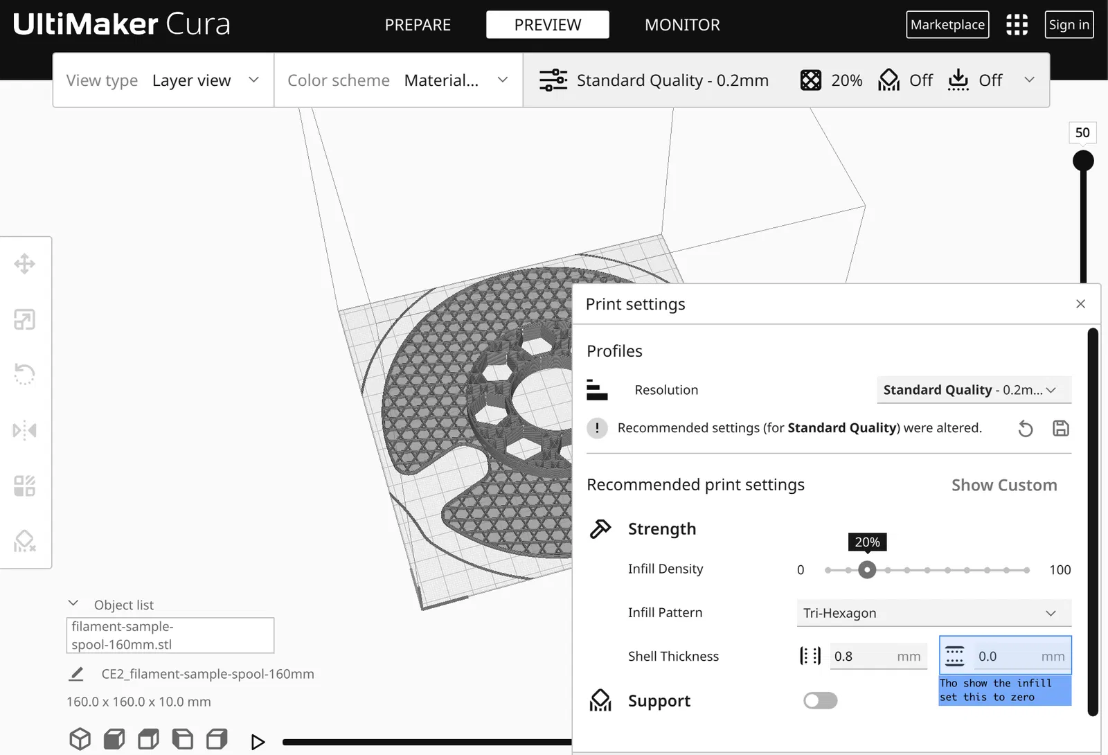 Tui thấy cái mẫu gốc hay lắm, nó không có quá nhỏ và có thể scale lại cho vừa với máy in của tui. Tuy nhiên, tui thích bỏ lớp đáy với lớp mặt trên khi in mấy cái mẫu dạng này, nên mấy cái lỗ lục giác kia chỉ tốn chỗ thôi.