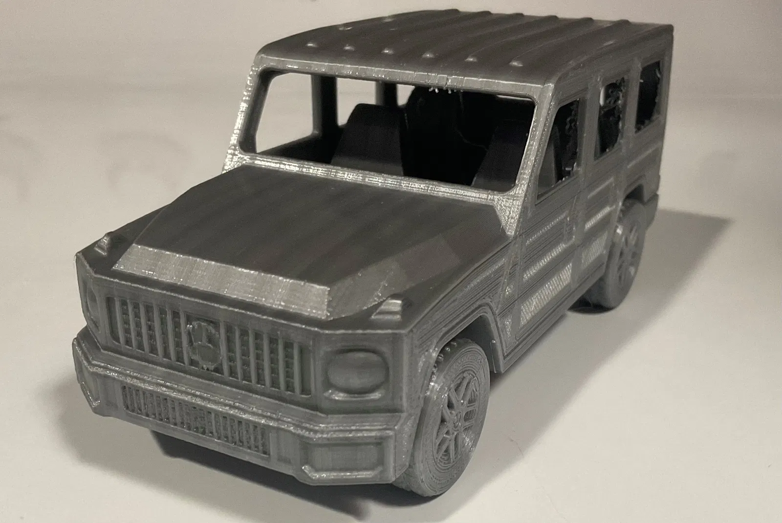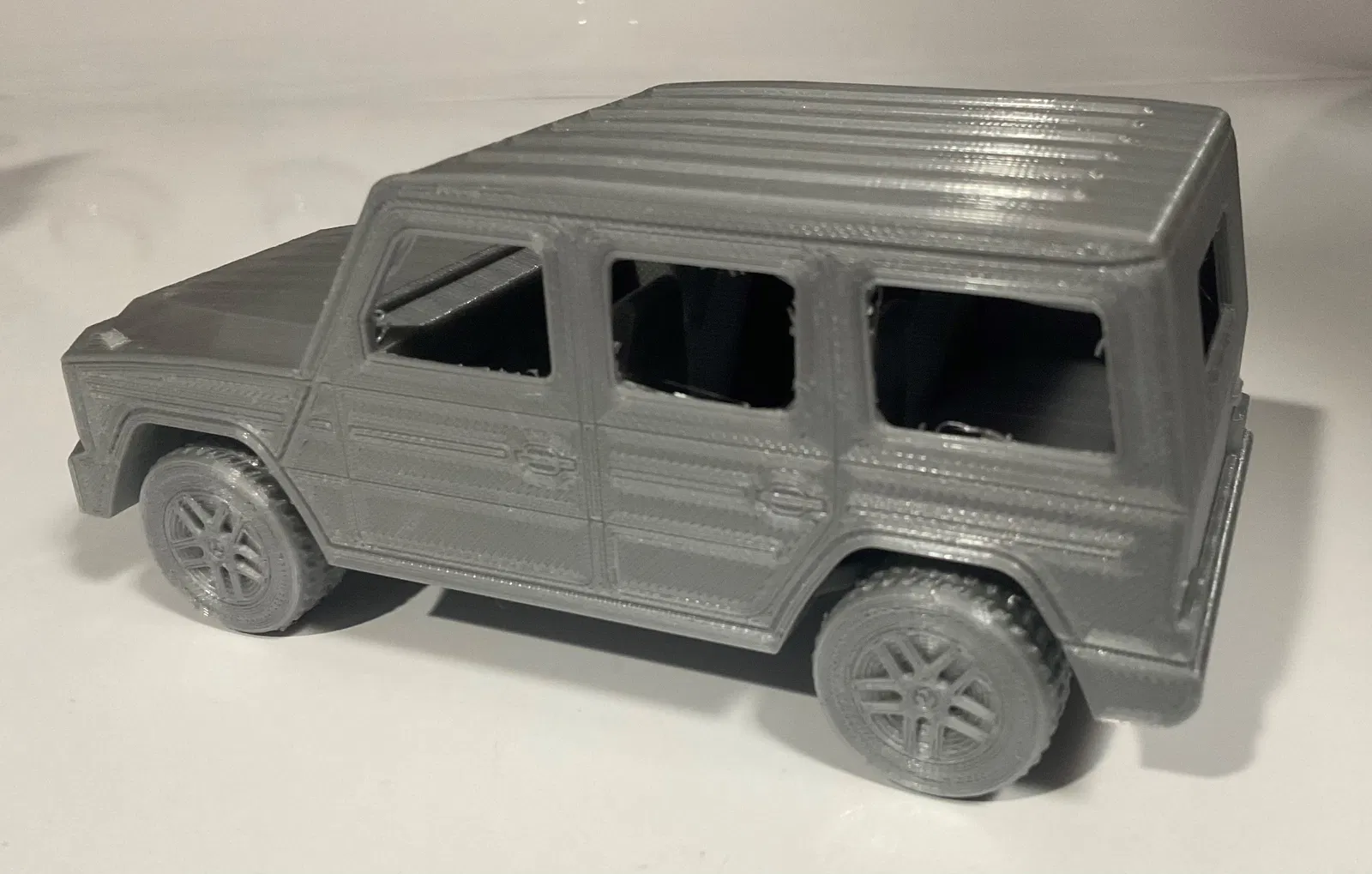 Mô hình xe Mercedes-Benz G-Wagen G 63 in liền, bánh xe di chuyển được. Thời gian in khoảng 16 tiếng, không cần support, dùng 76 gram nhựa PLA, độ cao lớp 0.16, 15% infill. Có thể bị ít dây nhựa xung quanh trụ xe.