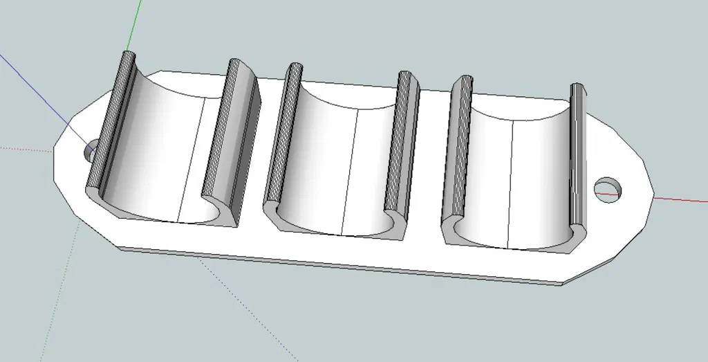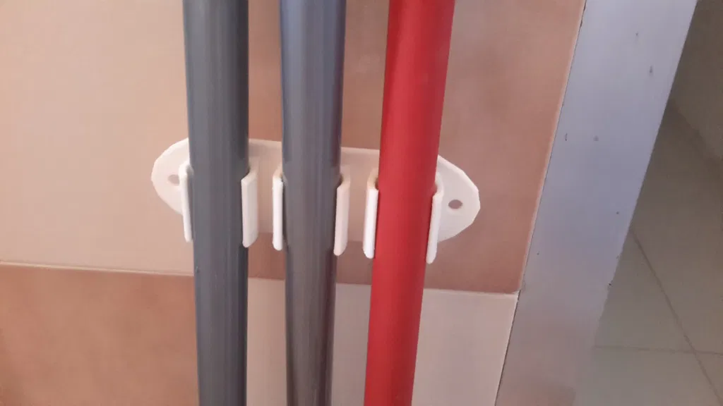 Giá treo chổi này có thể giữ ba cây chổi, phù hợp với nhiều loại đường kính khác nhau. Dễ dàng gắn lên tường bằng keo dán gai (velcro) hoặc bắt vít. Tải file STL hoặc SKP để in và tùy chỉnh.