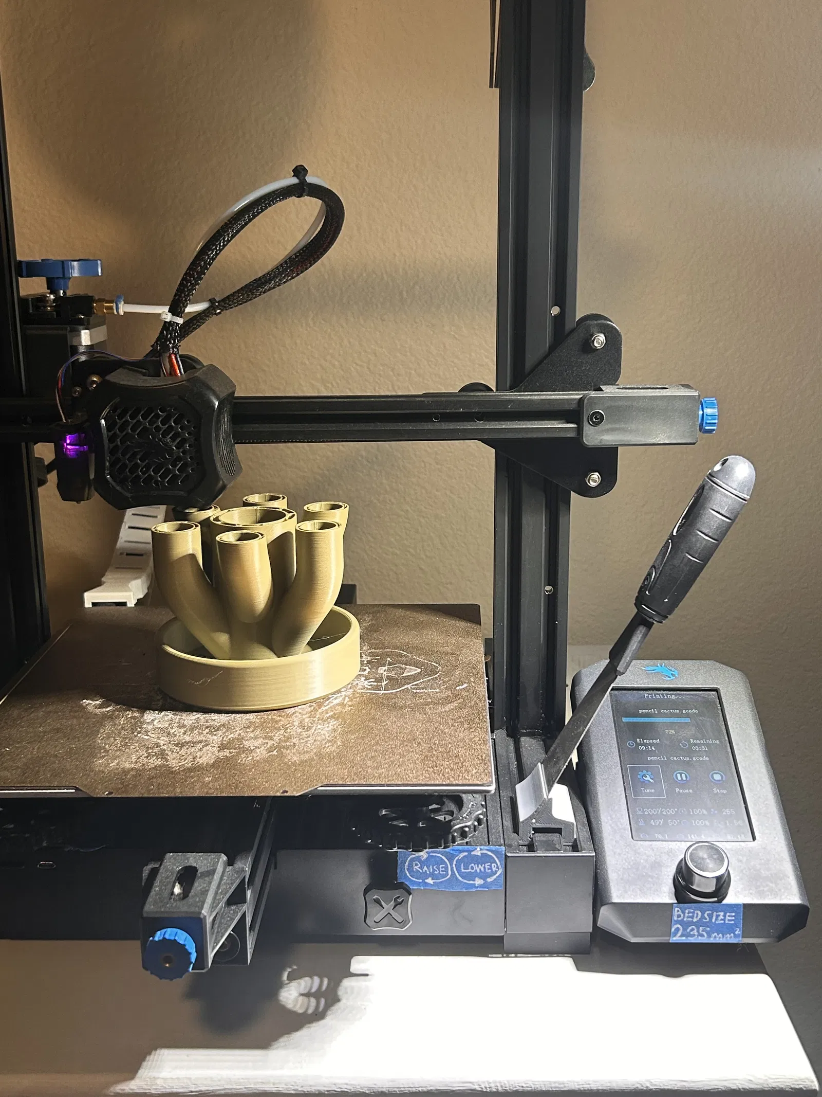 Giá đỡ cây spatula tiêu chuẩn, đặt ngay cạnh bàn in cho tiện dụng. Thiết kế cứng cáp, dễ dàng lắp vào rãnh nhôm của máy Ender 3. Vừa bảo vệ linh kiện, vừa không cản trở thao tác in.