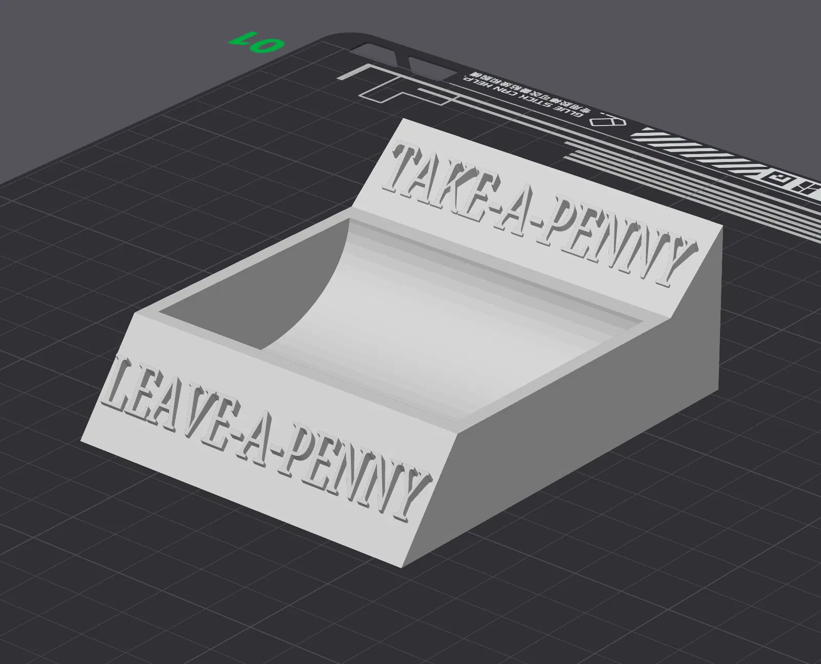 Một chiếc đĩa đựng tiền xu lẻ, lý tưởng cho các cửa hàng bán lẻ tại quầy thu ngân. Giải pháp thay thế cho việc mua số lượng lớn hoặc đồ nhựa đắt tiền. In bằng PLA với thành dày và độ điền đầy 30% để tăng độ bền. Đã được kiểm chứng sử dụng hơn một năm.