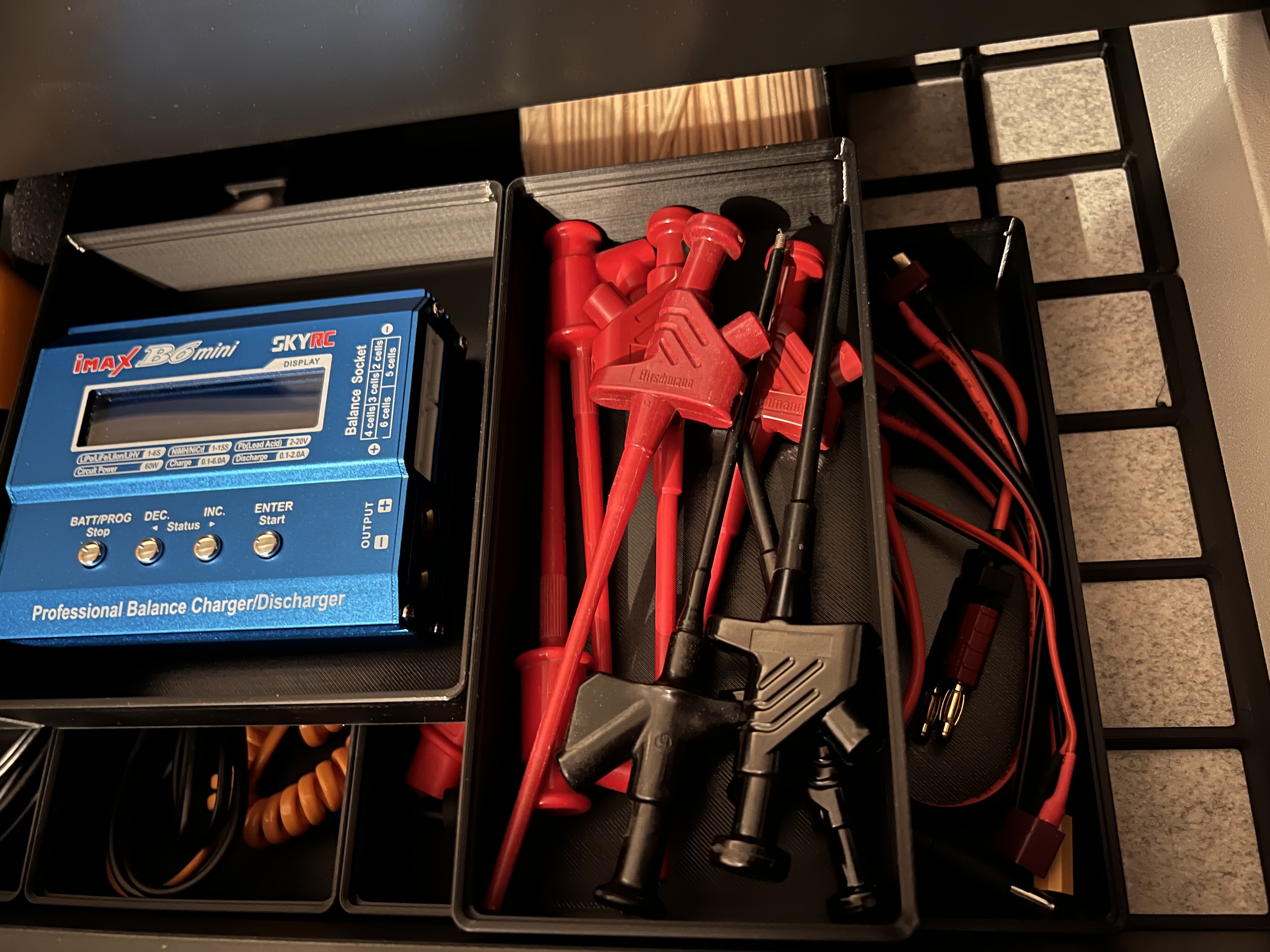 Tui đã tạo đế Gridfinity và hộp đựng vừa vặn cho ngăn kéo Ikea Nordli cao 11cm. Các hộp đựng lấp đầy toàn bộ chiều cao ngăn kéo, với chiều cao bằng nửa ngăn kéo. Tui cũng đang cân nhắc giải pháp cho ngăn kéo cao 22cm.