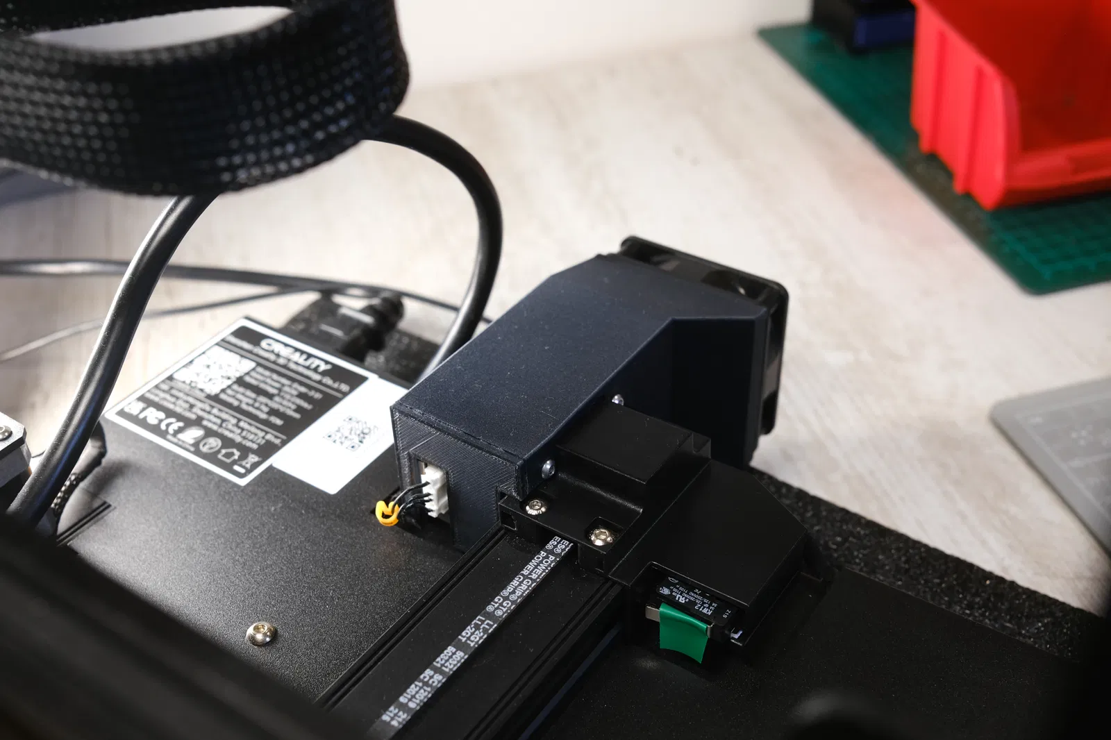 Quạt có thể đấu nối trực tiếp hoặc qua bộ điều chỉnh điện áp vào cổng dành cho phụ kiện. Bộ phận này đảm bảo motor stepper trục Y được làm mát tối ưu, giúp tăng tuổi thọ và hiệu suất của motor, đồng thời cho ra chất lượng in tốt hơn.