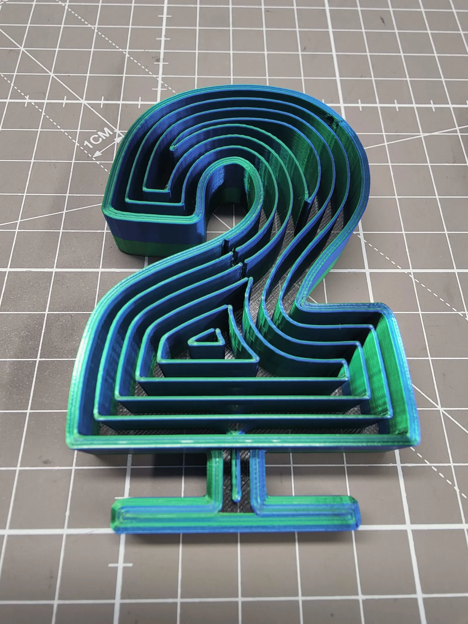 Vous pouvez aussi aller plus loin. Par exemple, prenez le chiffre 2 avec remplissage Concentrique à 20%. Ensuite ajoutez 3 couches solides dessous à imprimer en plastique transparent pour avoir un bel effet flottant.