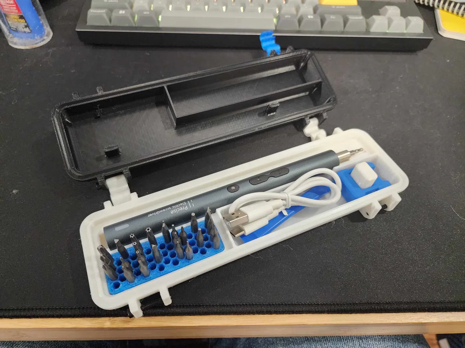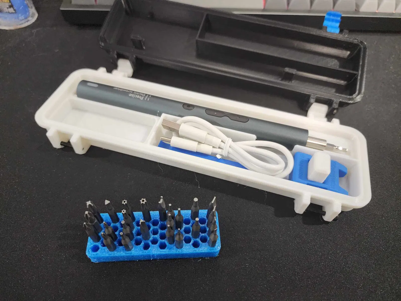 Theo thiết kế gốc, chiếc hộp cứng cáp này được thiết kế để chứa một tua vít điện tử chính xác cùng các phụ kiện đi kèm. Việc bổ sung một khay giữ mũi tua vít bằng TPU có thể tháo rời sẽ giúp bạn sắp xếp các mũi tua vít gọn gàng hơn, đồng thời dễ dàng lấy ra khi sử dụng.
