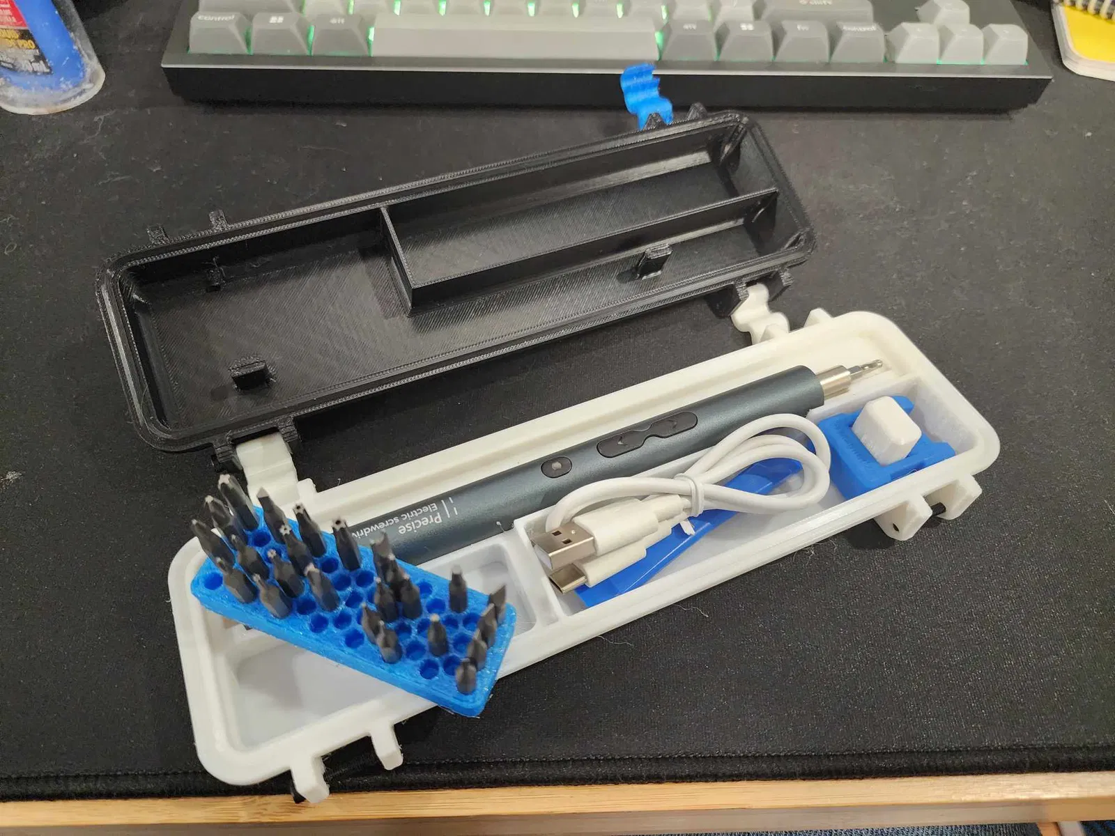 Hộp đựng tua vít điện tử chắc chắn, có khay TPU đựng mũi giúp dễ dàng lấy ra. Cần 8 ốc M3x20/M3x22mm cho bản lề. Bản lề in bằng PLA, chốt và khay mũi in bằng TPU cho tiện dụng.