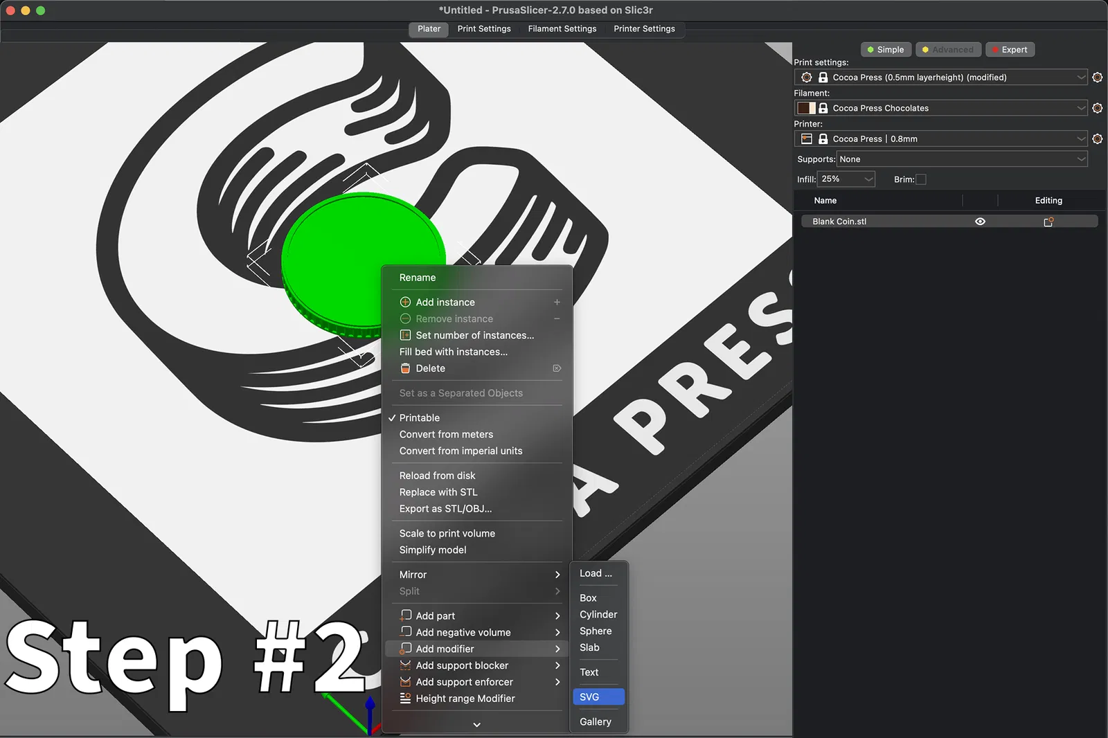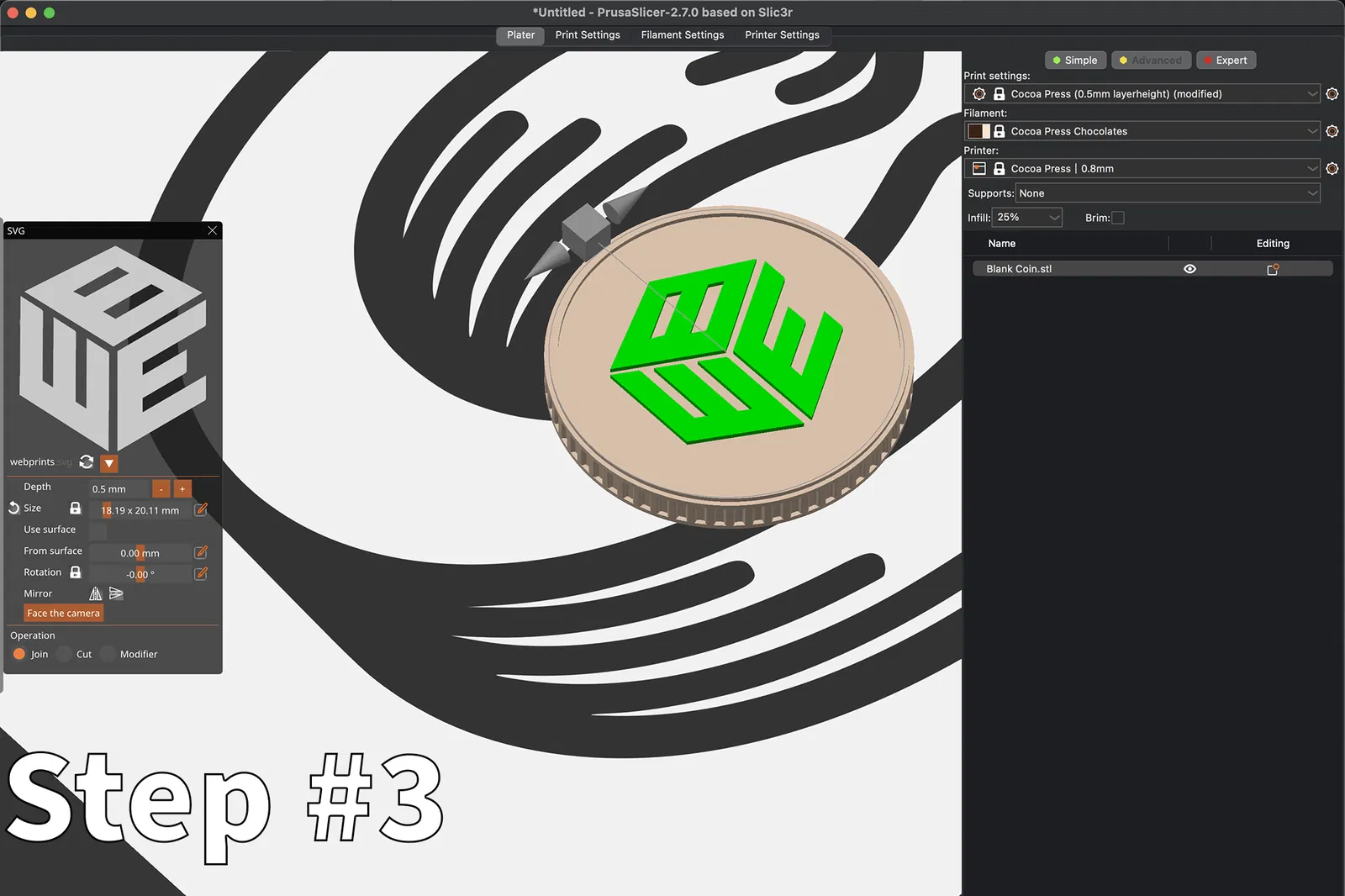 Blank Coin.stlvà đặt nó phẳng trên khay. Sau đó, sử dụng tính năng nhúng SVG mới, nhập tệp của bạn và áp dụng nó lên bề mặt đồng xu sô cô la của bạn. Để làm điều này, nhấp chuột phải vào đồng xu và chọnAdd Part > SVG. Sau đó chỉ cần thay đổi kích thước và đặt thiết kế vào vị trí bạn muốn trên đồng xu, và đặt chiều cao lớp. Các thiết kế của chúng tôi đều sử dụng các tính năng 0.5mm để khớp với một lớp trên Cocoa Press. - In đồng xu tùy chỉnh của bạn: Nạp sô cô la yêu thích của bạn vào máy in 3D và xem những đồng xu tùy chỉnh của bạn thành hình. Mỗi miếng cắn sẽ là sự pha trộn ngon tuyệt của hoài niệm game và phong cách cá nhân!