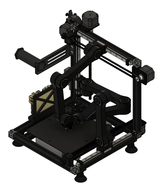Đây là phiên bản mới nhất trong công trình của tôi hướng tới một máy in nhỏ gọn dựa trên hệ thống chuyển động Tripteron. Cơ chế này song song trên cả 3 trục, tuyến tính và Descartes, với 1 động cơ cho mỗi trục.