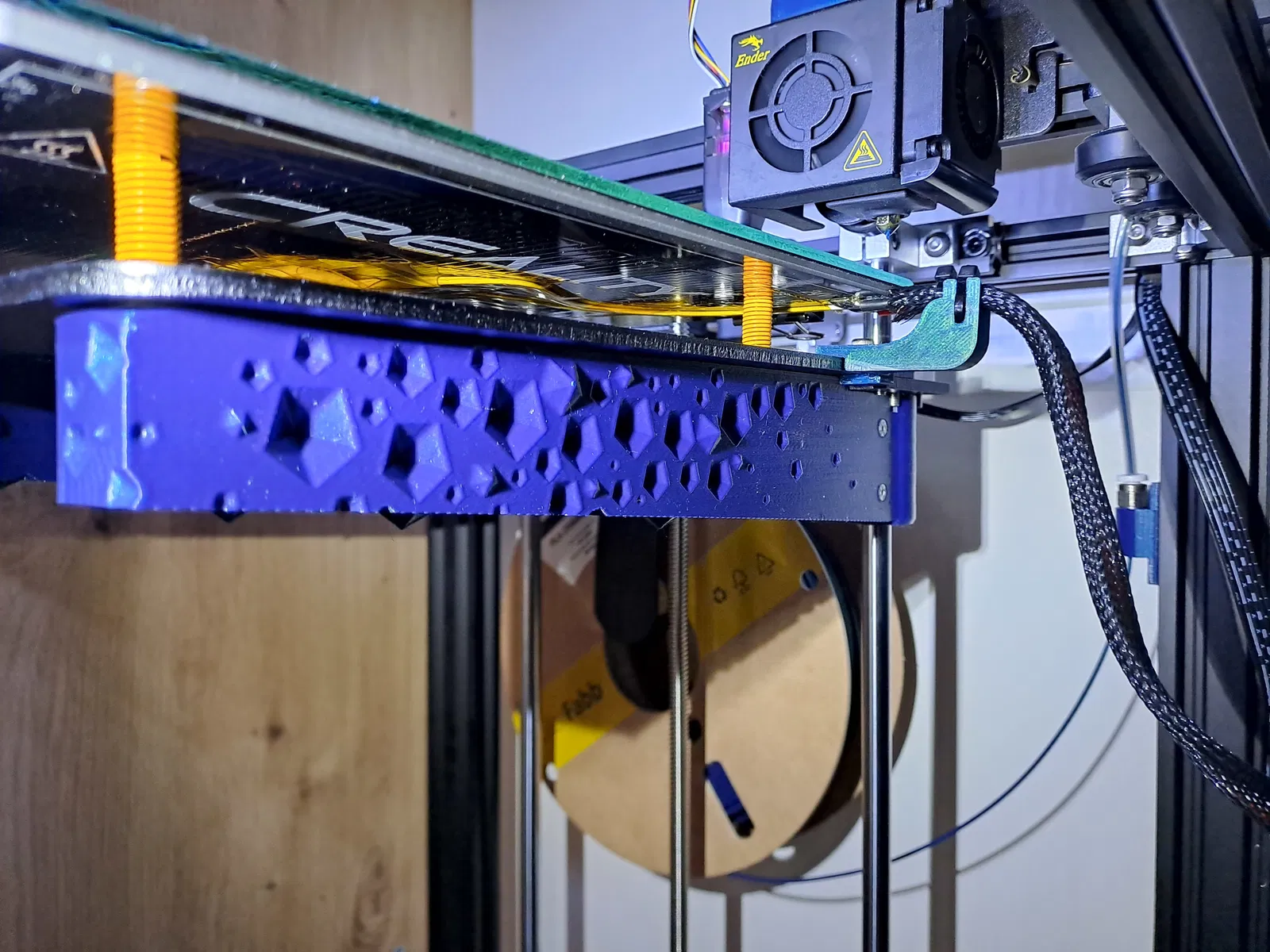 Tao thấy mấy cái support giường in 3D có sẵn trên mạng không có ưng ý lắm. Hoặc là nhìn không đẹp, hoặc là khó in, hoặc là phải chế thêm tùm lum cho nó chạy được… Nên tao tự làm cái của riêng mình luôn – đơn giản, xài được, mà nhìn cũng có tí "sexy" (ít nhất là với tao :)). Vụ nâng cấp máy in, tao xài sợi Chameleon Nebula của colorFABB và tao THÍCH cái kết quả lắm (trên hình không thấy rõ, mà nó là màu xanh/lá cây đổi màu đẹp bá cháy).