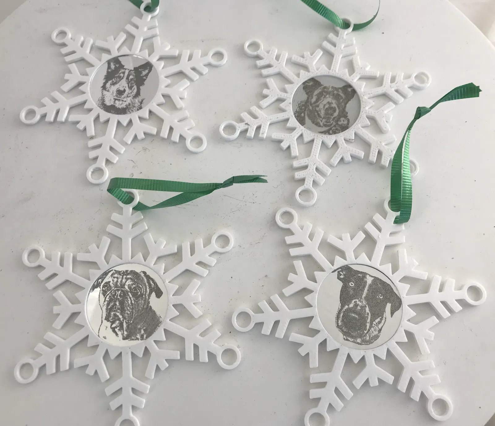 Tới mùa làm đồ trang trí rồi đó mấy ông ơi. Ông bạn Jim của tôi có gợi ý xài mấy cái gương tròn nhỏ nhỏ cho mấy dự án. Tôi quyết định khắc laser lên mấy cái gương đó hình thú cưng của bạn tôi để tặng dịp lễ. Tôi đã thiết kế và in 3D một cái khung bông tuyết để gắn cái gương khắc laser vô.