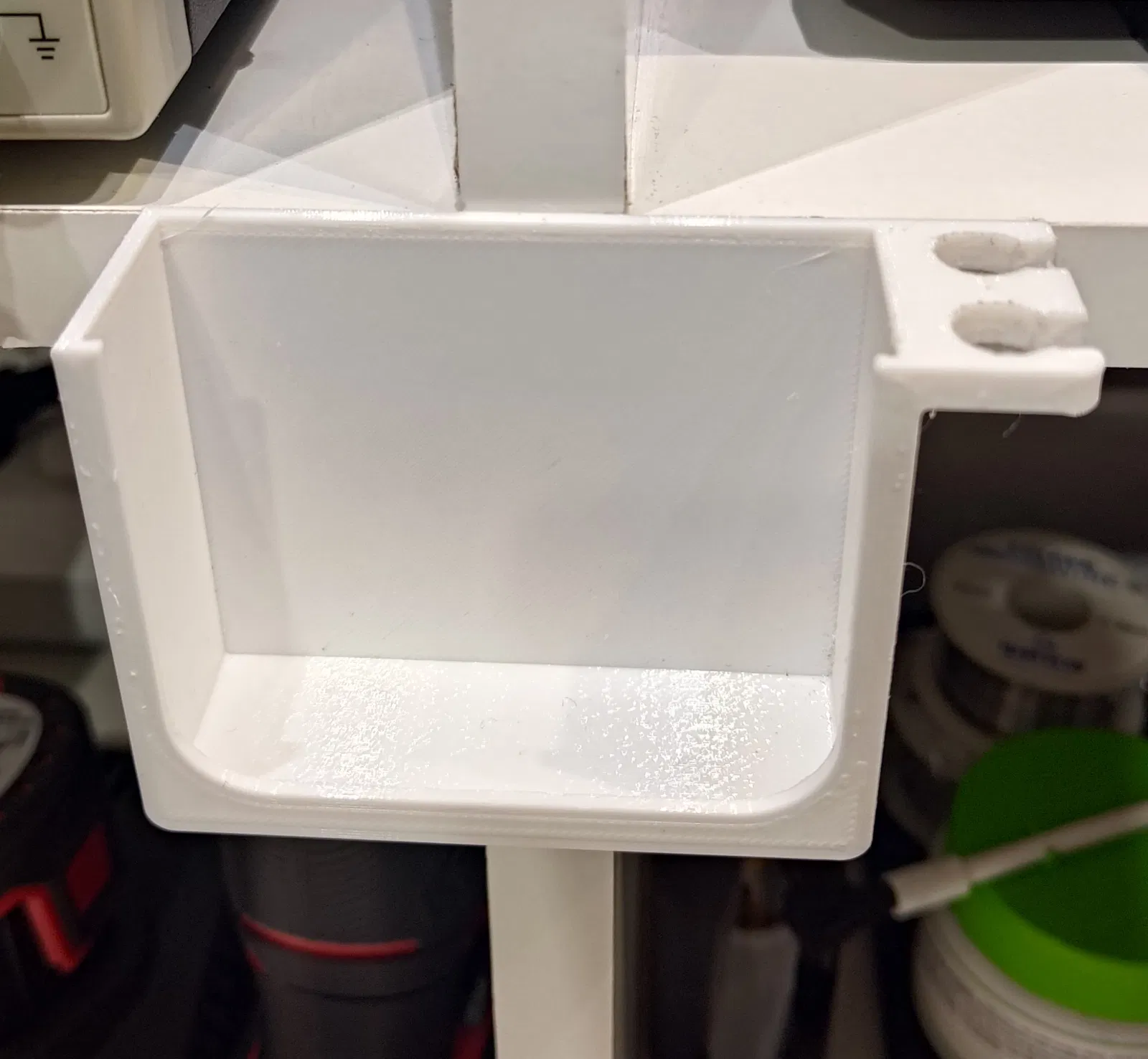 Cần cái giá đỡ đồng hồ đo multimeter 830 có bề ngang tối thiểu để gắn kệ. Có phiên bản gắn móc IKEA Skadis và phiên bản gắn ray DIN 35mm. Dùng băng keo hai mặt để cố định, xài PETG cho rẻ.
