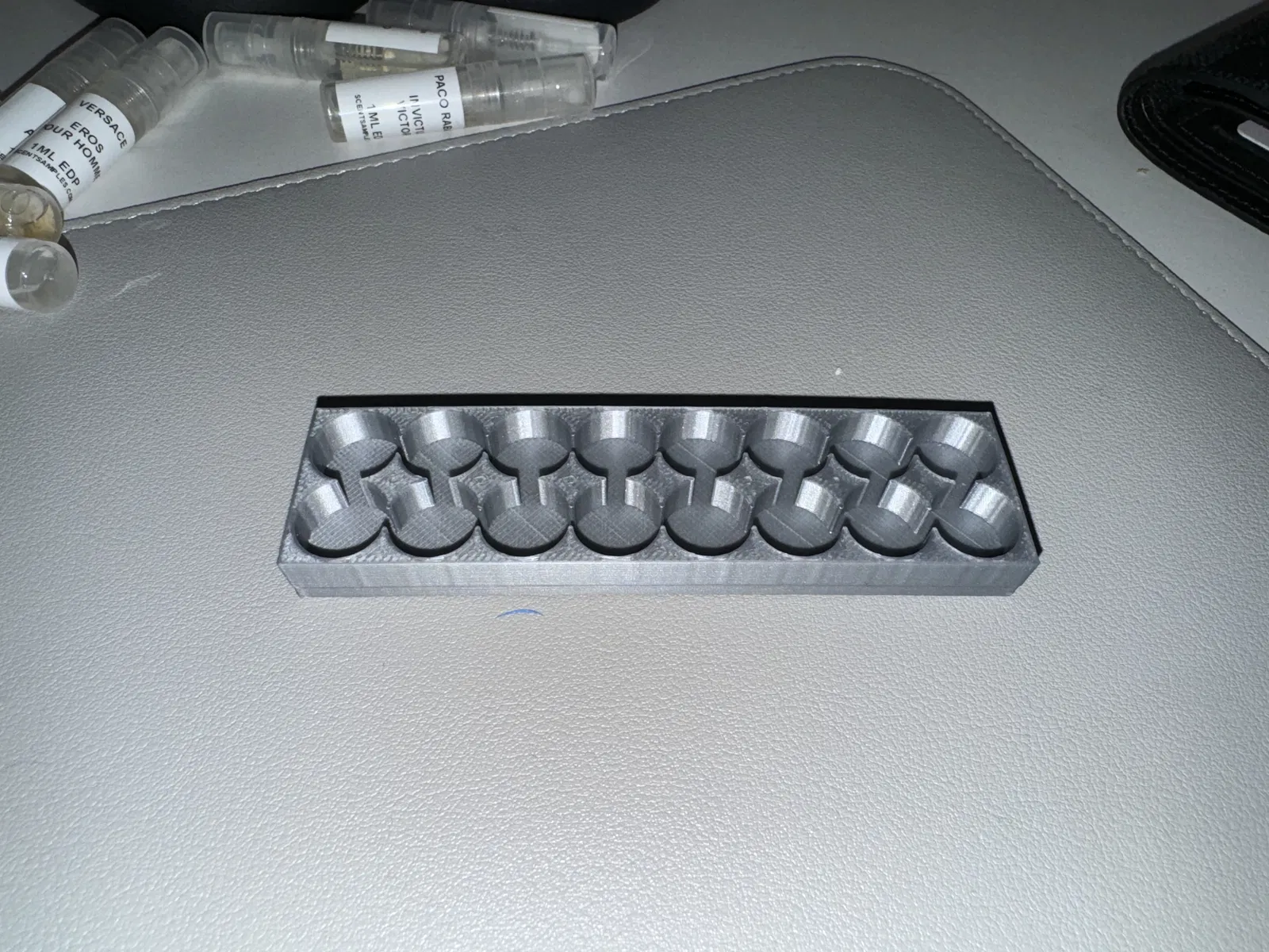 In "In", it was made to fit the 1ml scent sample bottle from scentsamples.com. The compact holder can hold up to 16 1ml scent bottles. This model was designed for personal use and is ideal for those who collect or frequently use scent samples. The holder is designed to be compact and easy to store. The file is available in STL format for easy printing on most 3D printers. For best results, print with high infill.