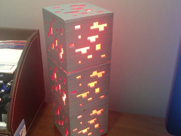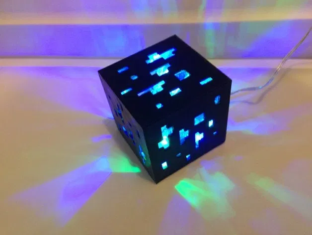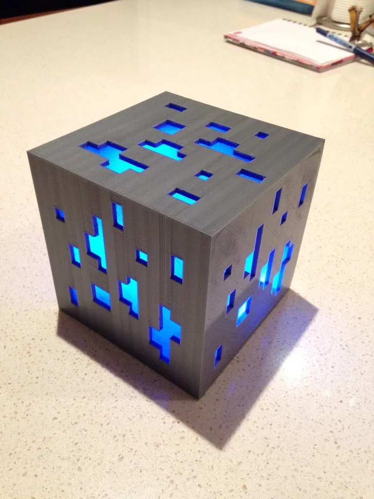 Mô hình đèn lấy cảm hứng từ quặng Minecraft, có hai phiên bản và tùy chọn in hai màu. Bao gồm hướng dẫn in, liên kết đến các bài viết và dự án liên quan, cùng với hướng dẫn hậu xử lý để tạo thành đèn RGB hoặc đèn ngủ.