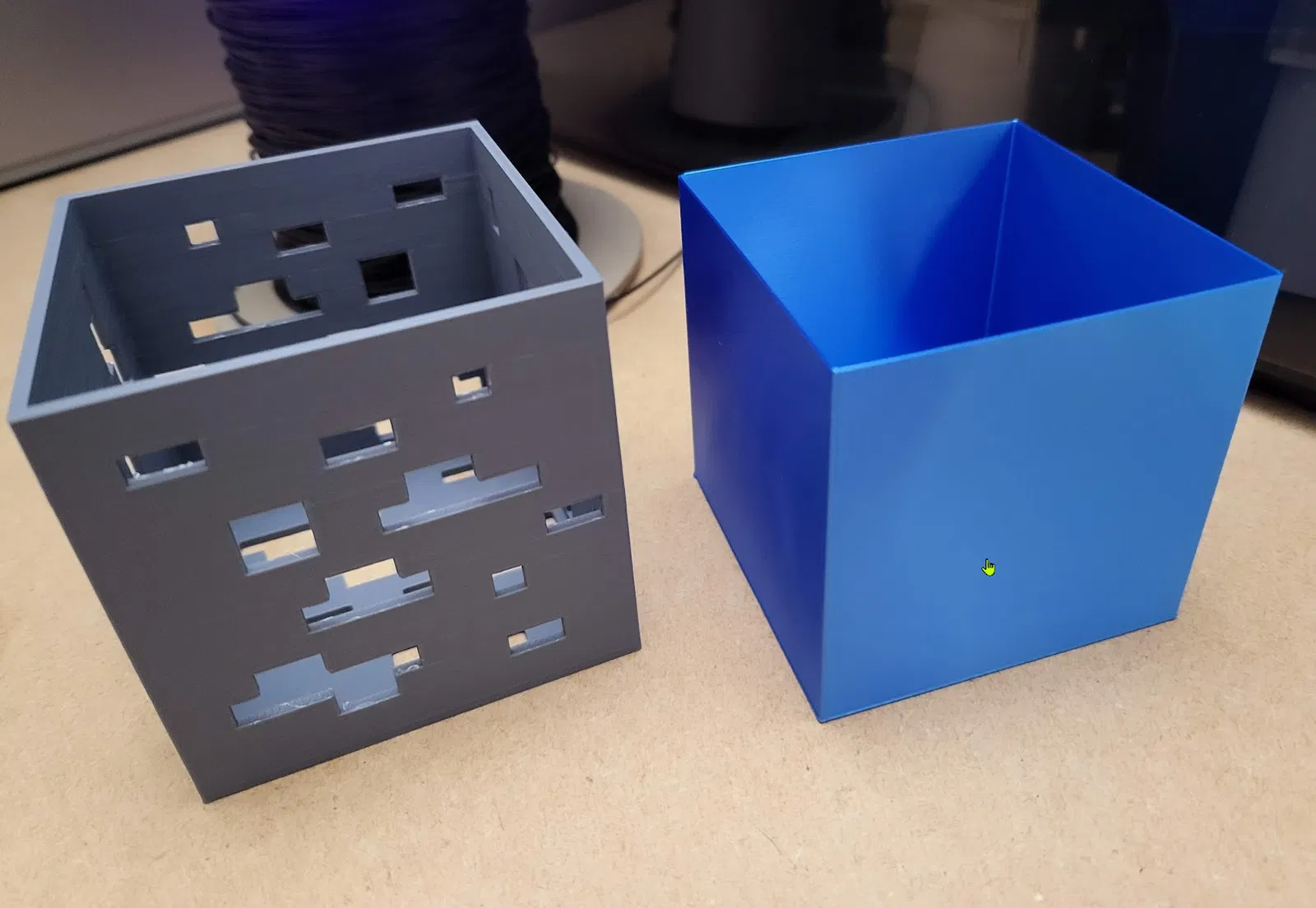 In chế độ vase (xoắn ốc). 0.2mm. Tôi đã sử dụng PLA lụa màu xanh lam, trông rất đẹp khi có đèn LED màu xanh bên trong. Bạn có thể sử dụng các màu khác nhau hoặc PLA trắng mờ để tạo thành một khối lập phương đổi màu.