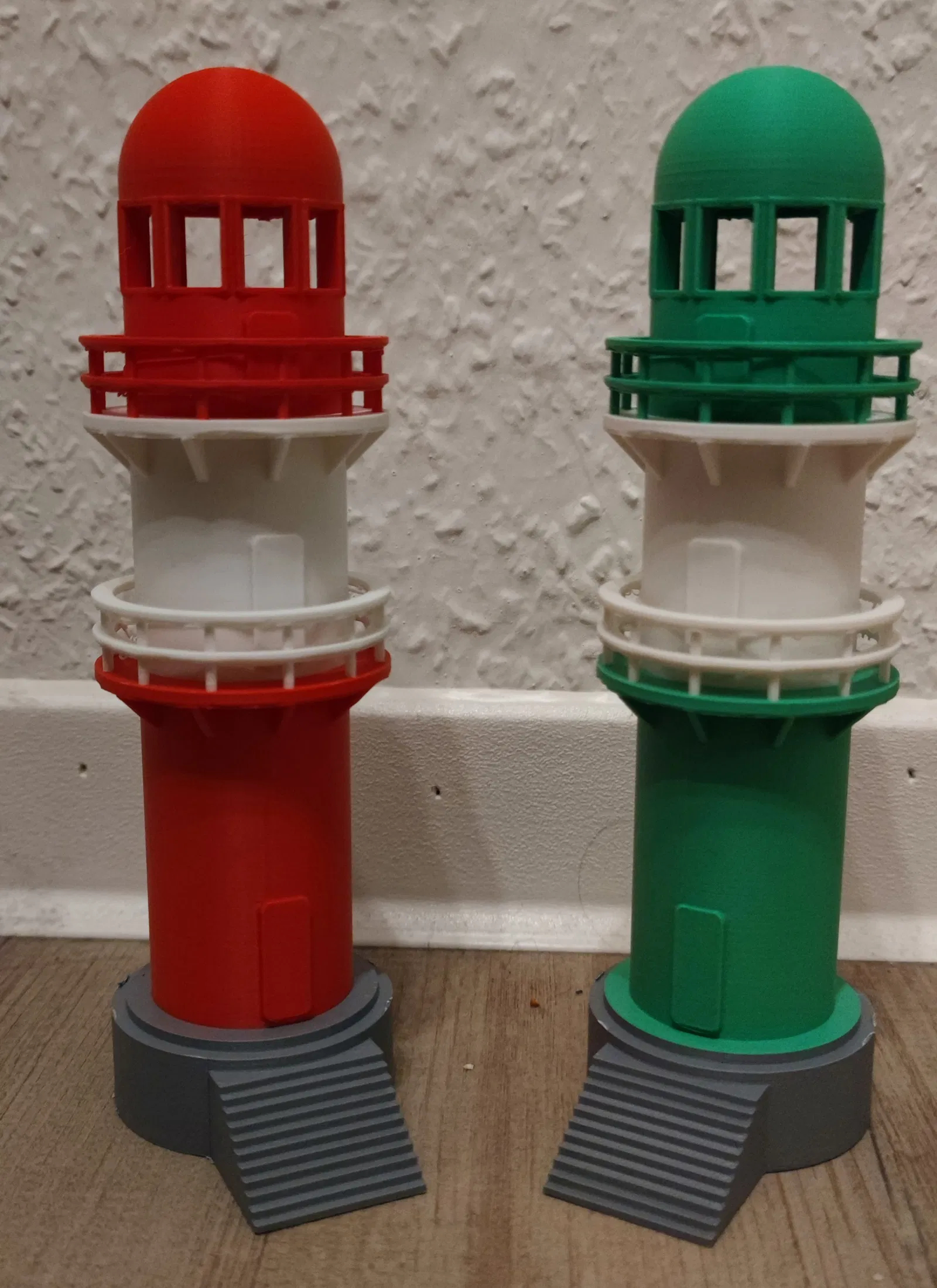 Mô hình hai ngọn hải đăng xanh đỏ tại Warnemuende, Rostock, Đức. Được in bằng Bambulab P1S với nhựa PLA, cần hỗ trợ cho các chi tiết cửa sổ và bệ đỡ nhô ra.