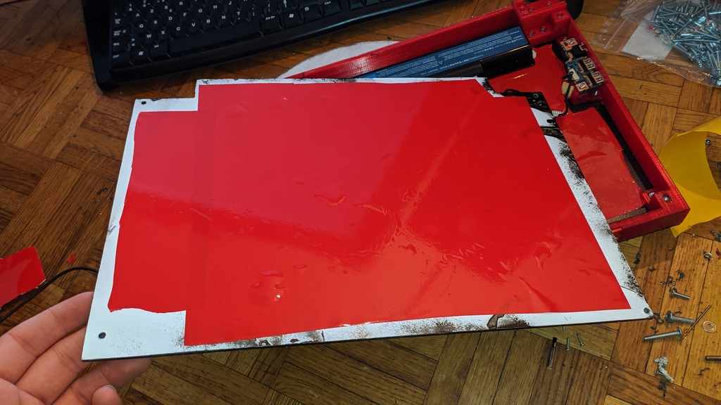 Không có gì quá phức tạp, mình đã dùng một bàn phím Bluetooth mỏng, tấm "dibond" và ốc vít tiêu chuẩn.