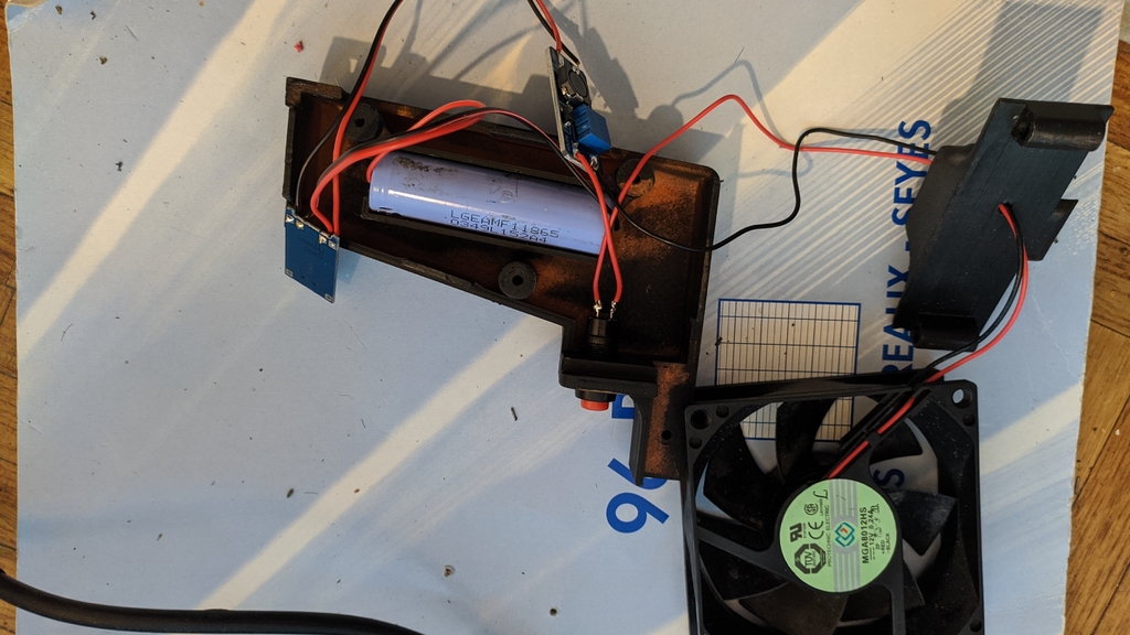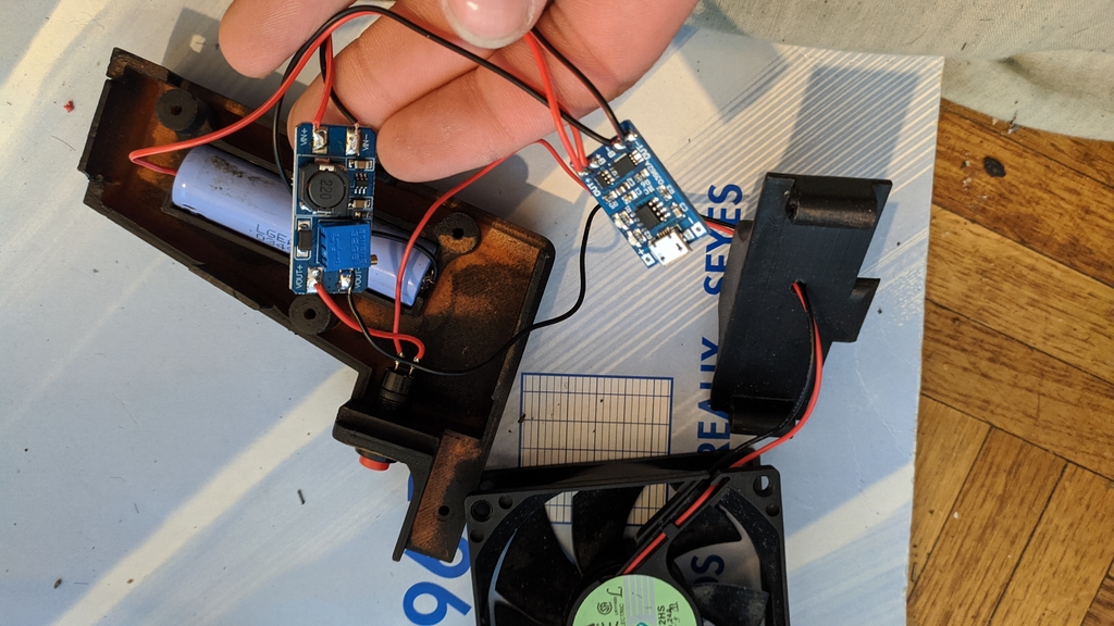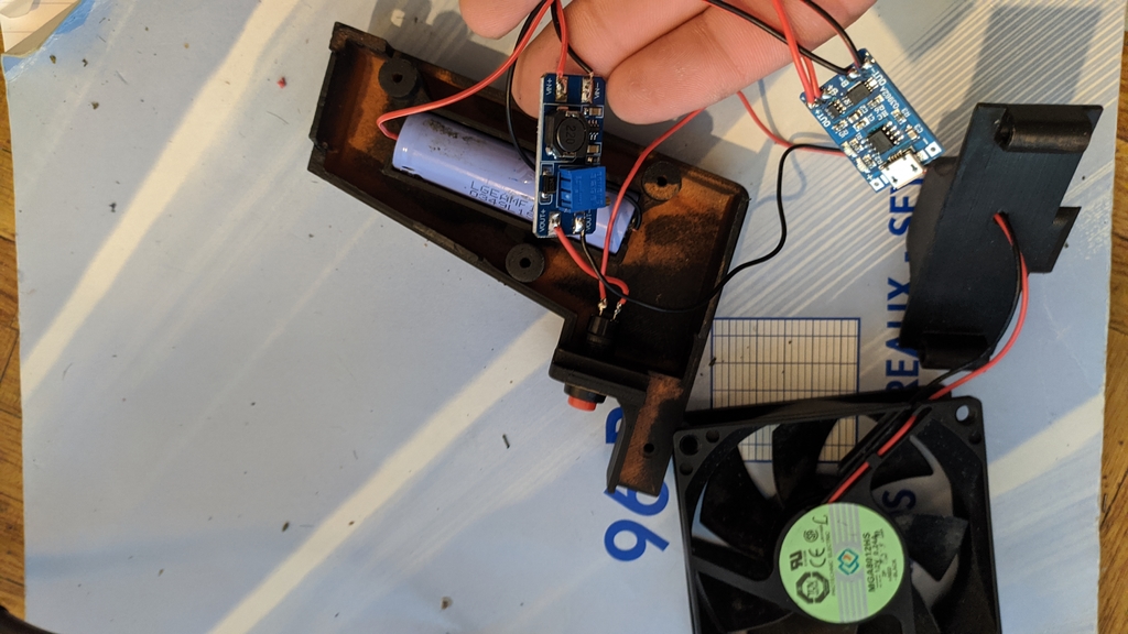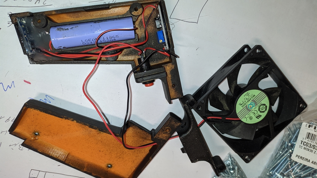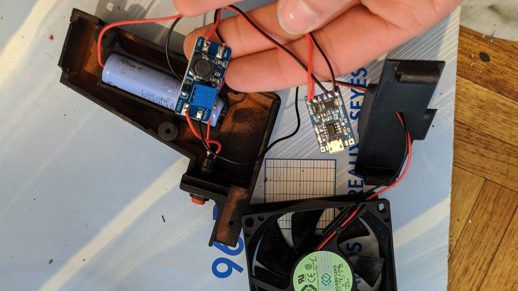 Ba mình nhờ làm quạt thổi than BBQ cho mau bén lửa nên mình làm cái súng quạt mini sạc pin này. Cần pin 18650, module sạc TP4056, mạch nâng áp MT3608 và quạt 80mm 12V. Lắp ráp theo hình hướng dẫn nha.
