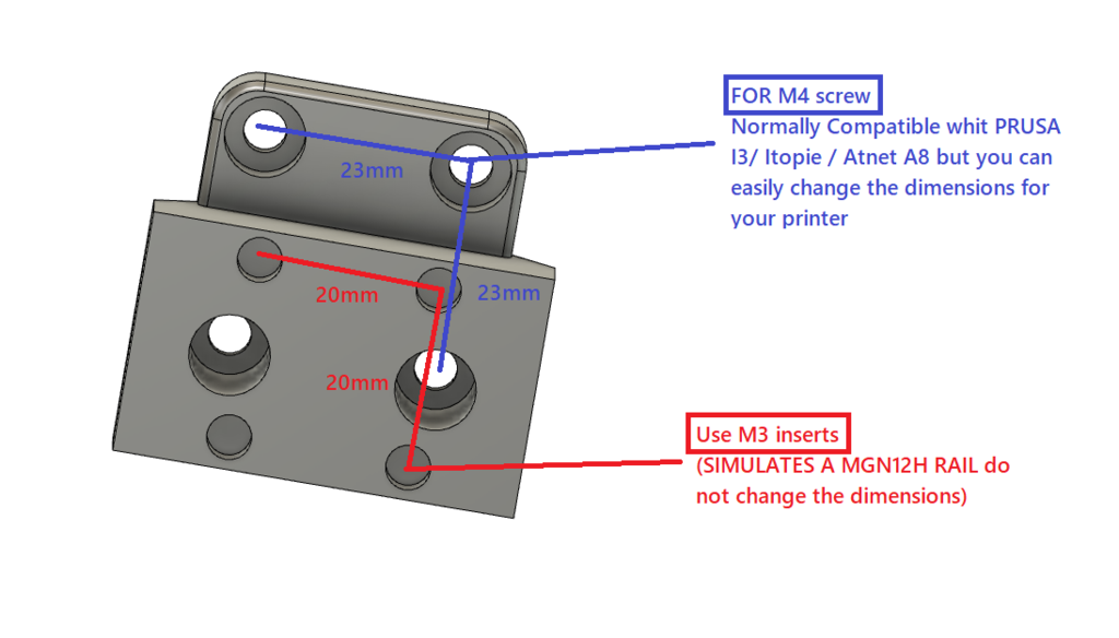 Bạn chỉ cần 4 ốc ren M3 để lắp vào 4 lỗ cách nhau 20mm, điều này sẽ mô phỏng thanh ray MGN12H.