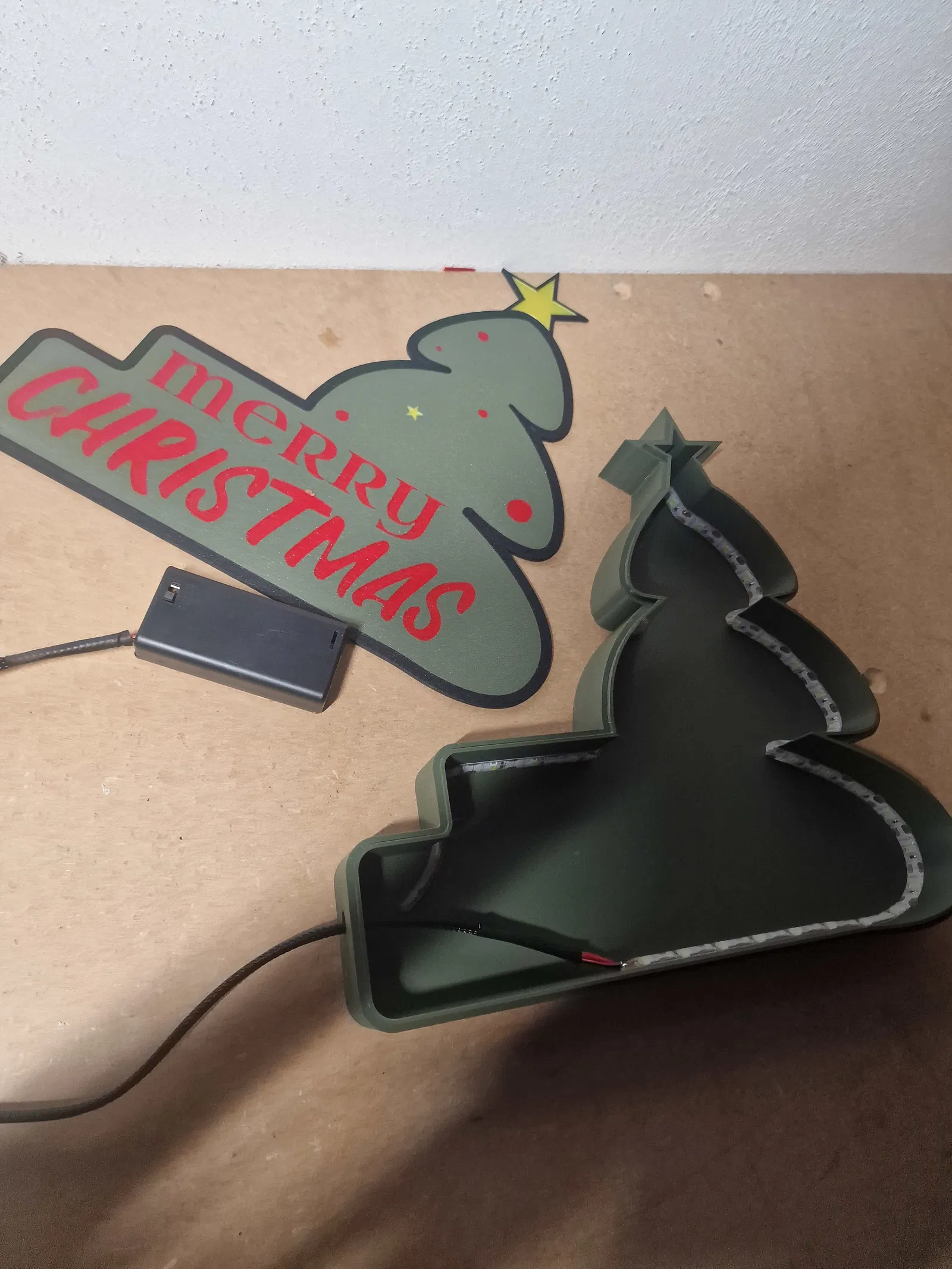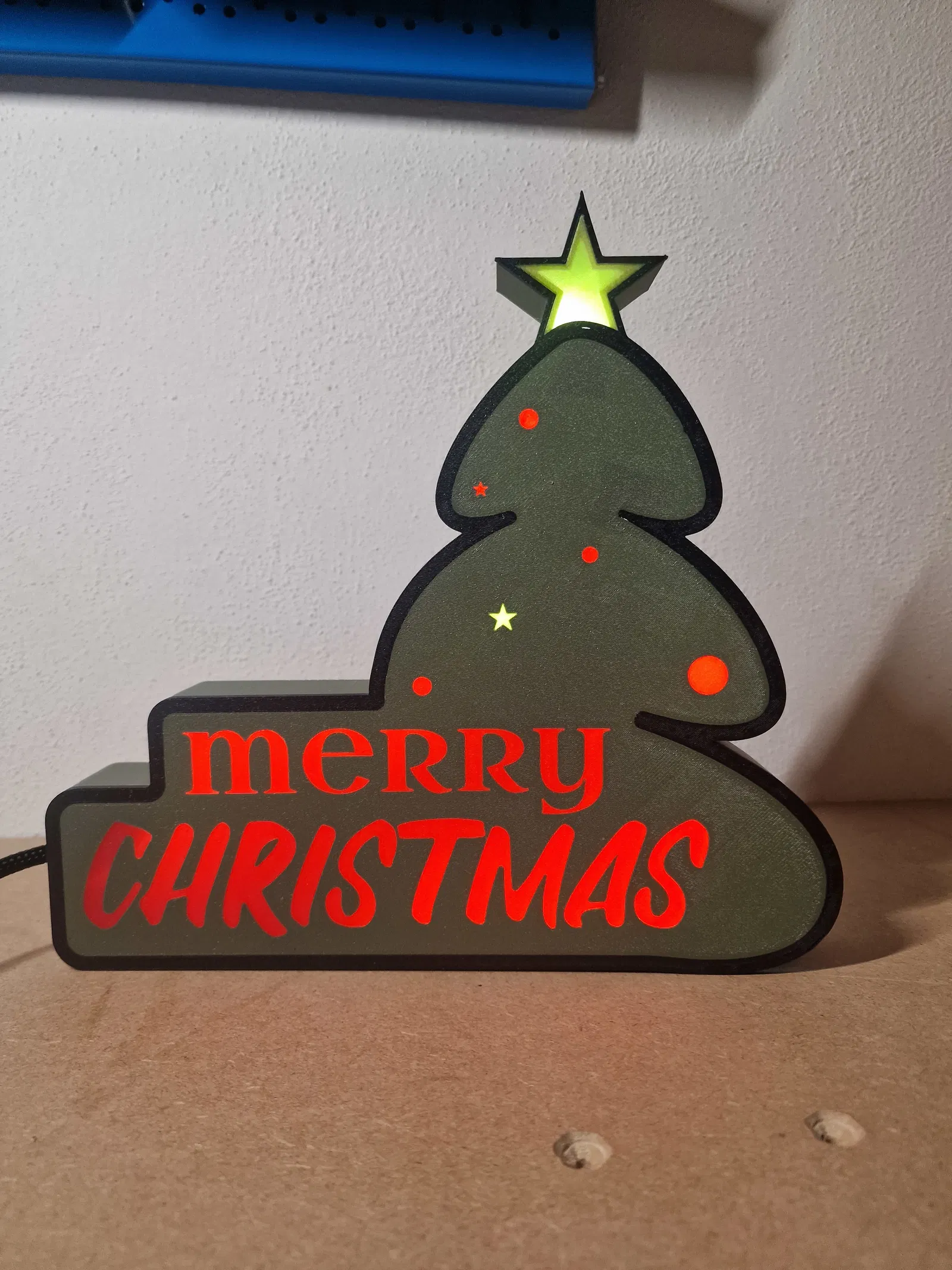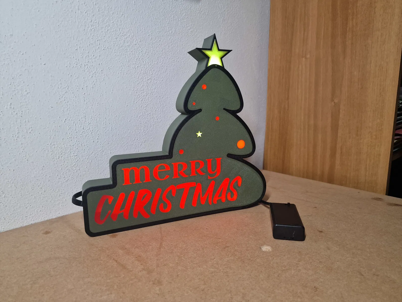 Tui làm đèn cây thông Noel bằng cách in 3D, có đèn LED bên trong cho ánh sáng lung linh. Thiết kế này có hộp pin gắn ngoài tiện lợi, dây nối được bọc gọn gàng. Mẫu đèn "Merry Christmas" này tui còn nâng cấp lên máy in lớn hơn để có sản phẩm hoành tráng hơn. Rất thích hợp để trang trí dịp lễ Giáng Sinh!