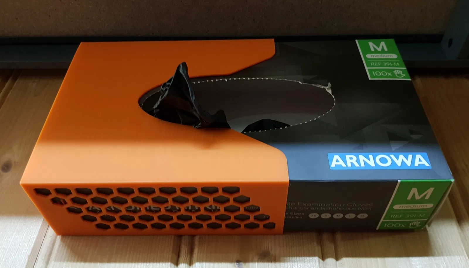 Giá đỡ hộp găng tay nitrile gắn tường với 3 lỗ bắt vít. Kích thước hộp găng tay nitrile là 240*127*60. In bằng PLA, không cần support, tốc độ bình thường. Có link Amazon tham khảo.