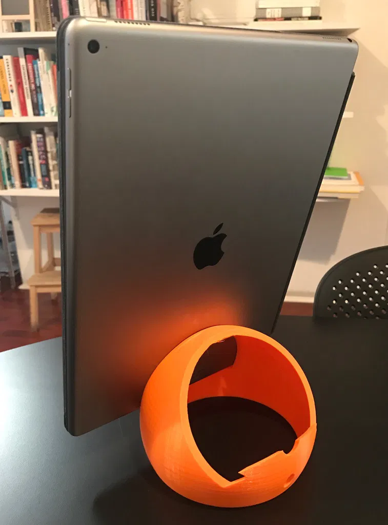 Chân đế iPad một mảnh với hai góc nghiêng. Có thể in cho iPad Pro (hình ảnh) với đường kính 150mm, hoặc cho iPad nhỏ hơn bằng cách thay đổi đường kính.