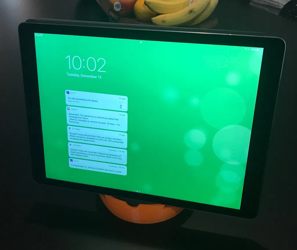 Ghi chú: Khi in cho iPad, hãy dùng 3 lớp vỏ để tăng độ bền cho bên ngoài và giúp phần nhô ra ở giữa hình cầu in tốt hơn. Lưu ý: kích thước in tối đa của MakerBot Mini là 10cm, đủ để giữ iPad Mini, hoặc với góc 40 độ, có thể dùng cho iPad Air thông thường. Sử dụng file OpenSCAD để thay đổi các giá trị này, tạo file .stl mới và in: https://github.com/thrasher/ipad-mini-stand