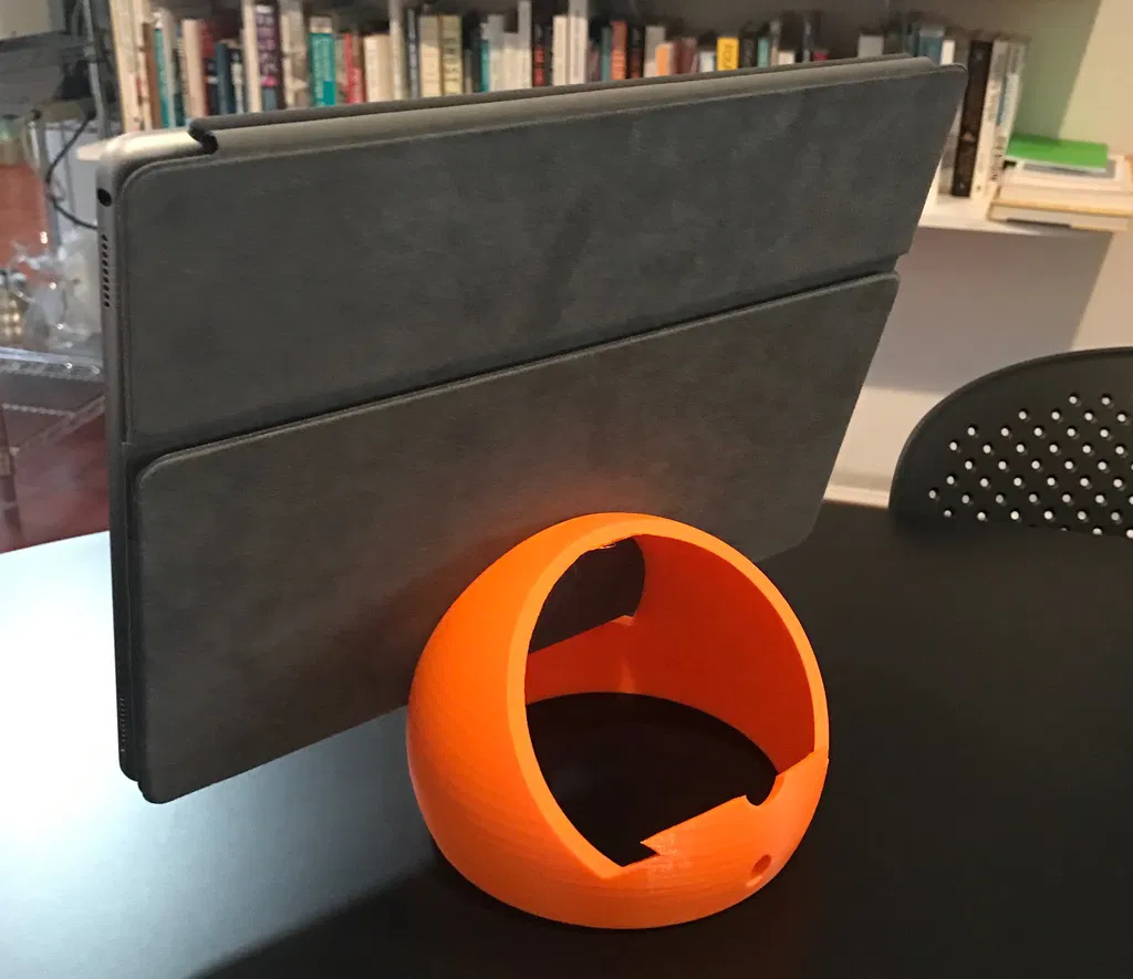 Ban đầu được thiết kế để giữ iPad cho vợ tôi. Bà ấy muốn đọc dễ dàng, với góc nghiêng hơn so với ốp lưng/bao da của iPad. Tôi muốn hỗ trợ iPad, cũng như các máy tính bảng khác, có hoặc không có bao da. Tôi cũng muốn có thể thêm văn bản tùy chỉnh, nhưng ở bên trong hình cầu, để không bị lộ ra ngoài. Thư viện Write.scad hoạt động cho việc này, mặc dù cần một chút thủ thuật để viết trên mặt trong của hình cầu.