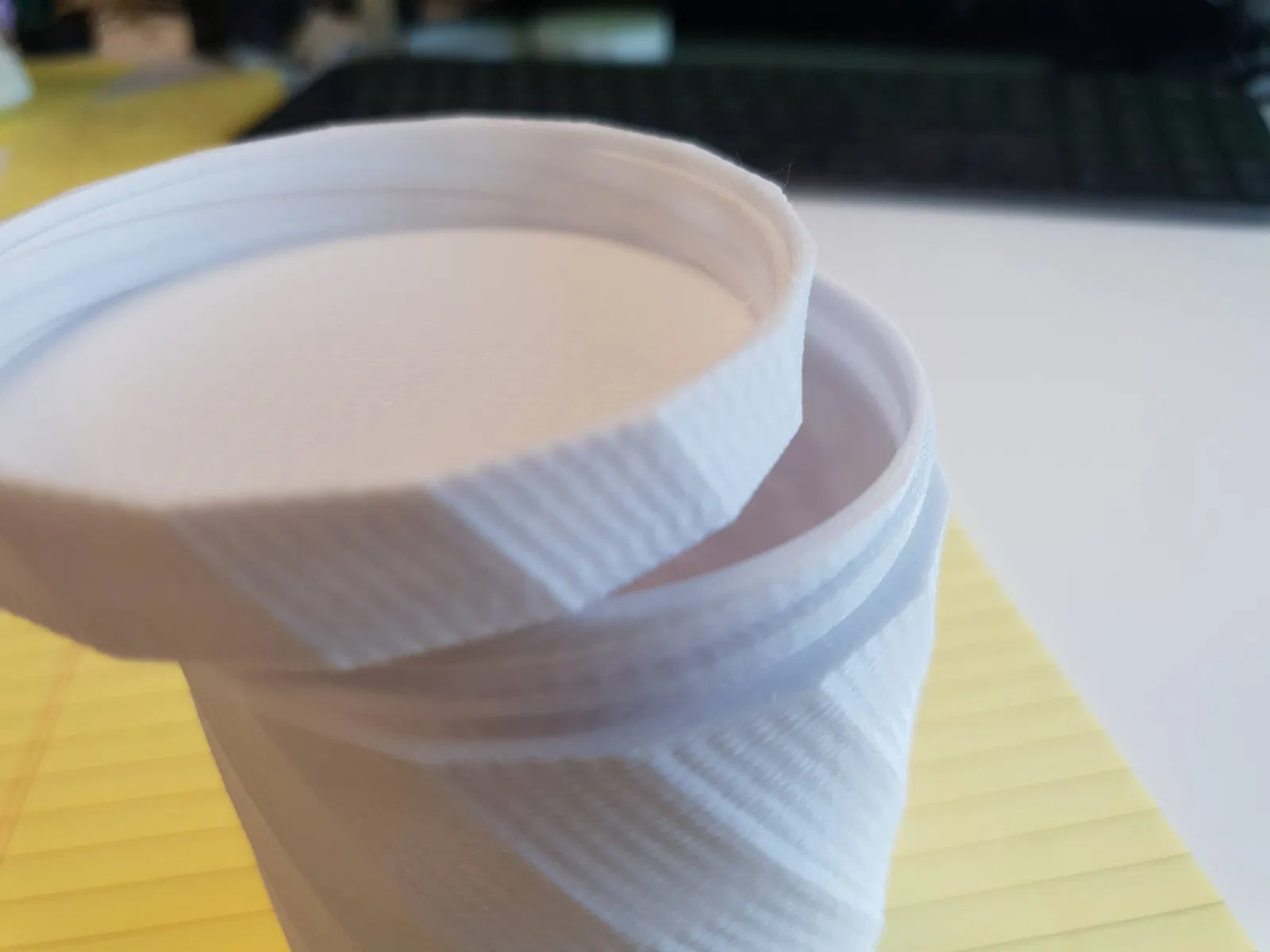 - Tôi đã thêm ba ren cho nắp/khóa xếp chồng để làm cho nó mạnh mẽ, ổn định và khóa chúng nhanh chóng. Tuy nhiên, các mặt bên là 16 (2^4), đây là một sai sót thiết kế, vì vậy nó đã làm cho sự căn chỉnh xoắn không khớp 66% số lần ngẫu nhiên như thấy trong bức ảnh thứ ba :-( Bạn có thể điều chỉnh tham số Mặt nhưng không kiểm tra sự căn chỉnh.