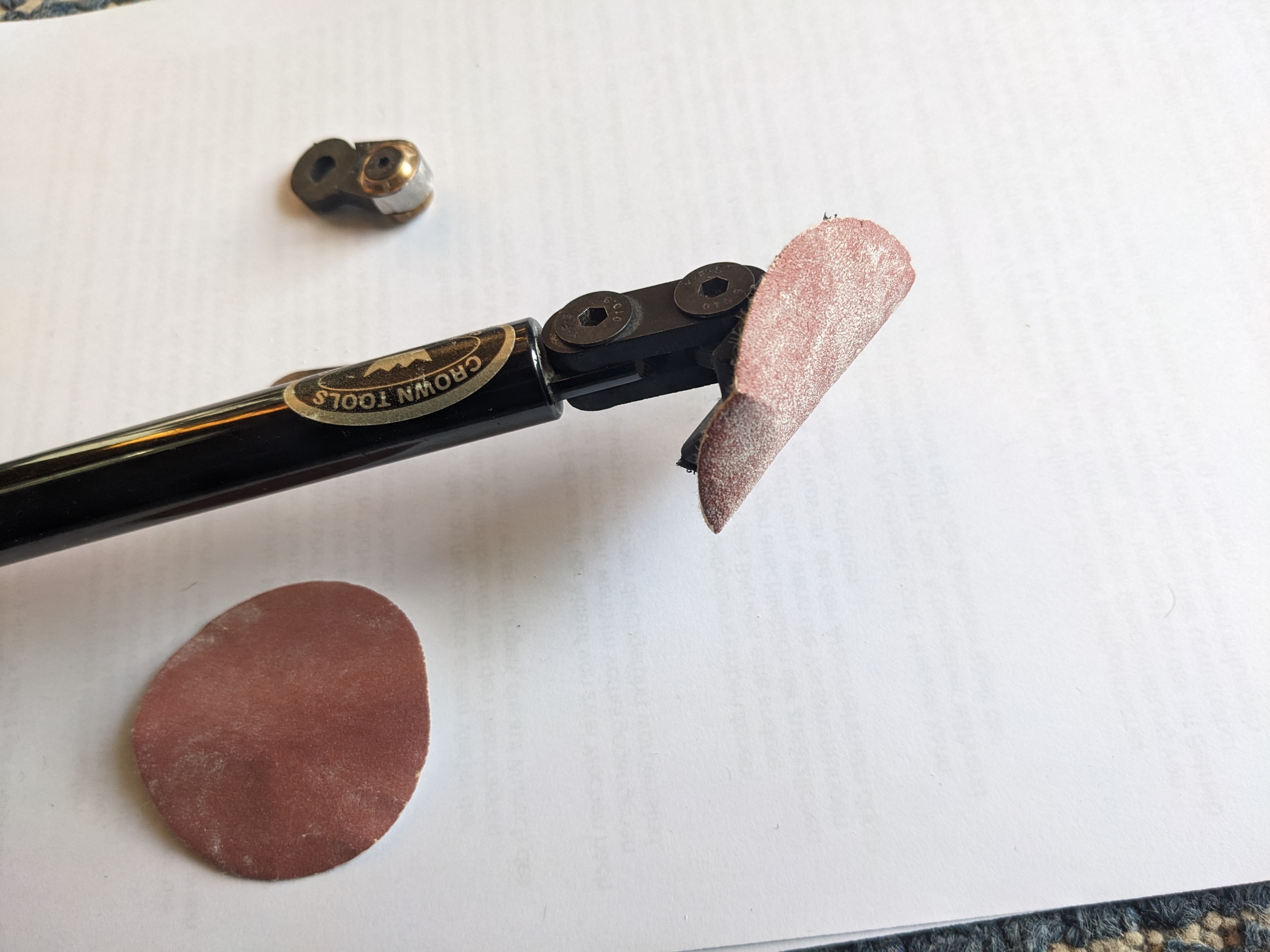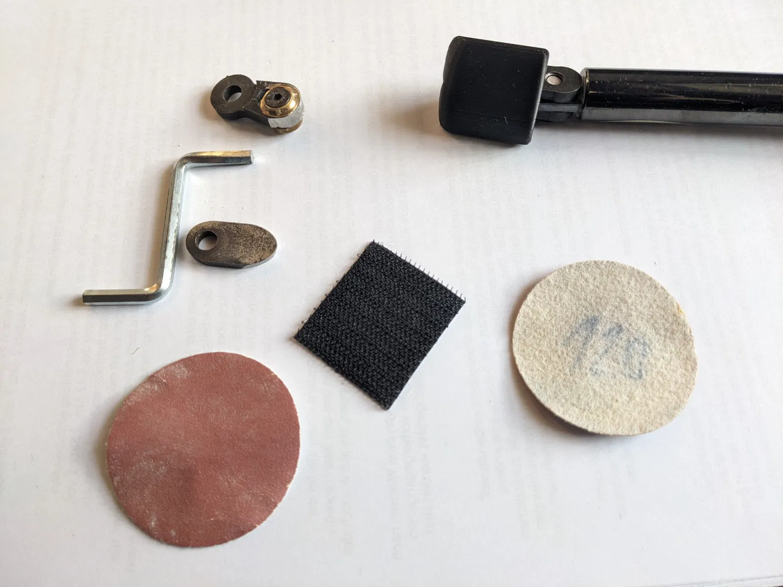 Đây là một bộ chuyển đổi cho công cụ Crown Revolution (tôi có phiên bản midi, nhưng nó nên phù hợp với tất cả các biến thể), nó chỉ cần vặn vào vị trí bằng phần cứng tiêu chuẩn. Bạn có thể nghiêng nó 180°. Tôi đã dùng một ít băng dính gai dầu tự dính để dán các đĩa chà nhám 50mm lên bề mặt. Các đĩa sẽ nhô ra ở tất cả các cạnh, vì vậy bạn cũng có thể chà nhám vào các góc, v.v.
