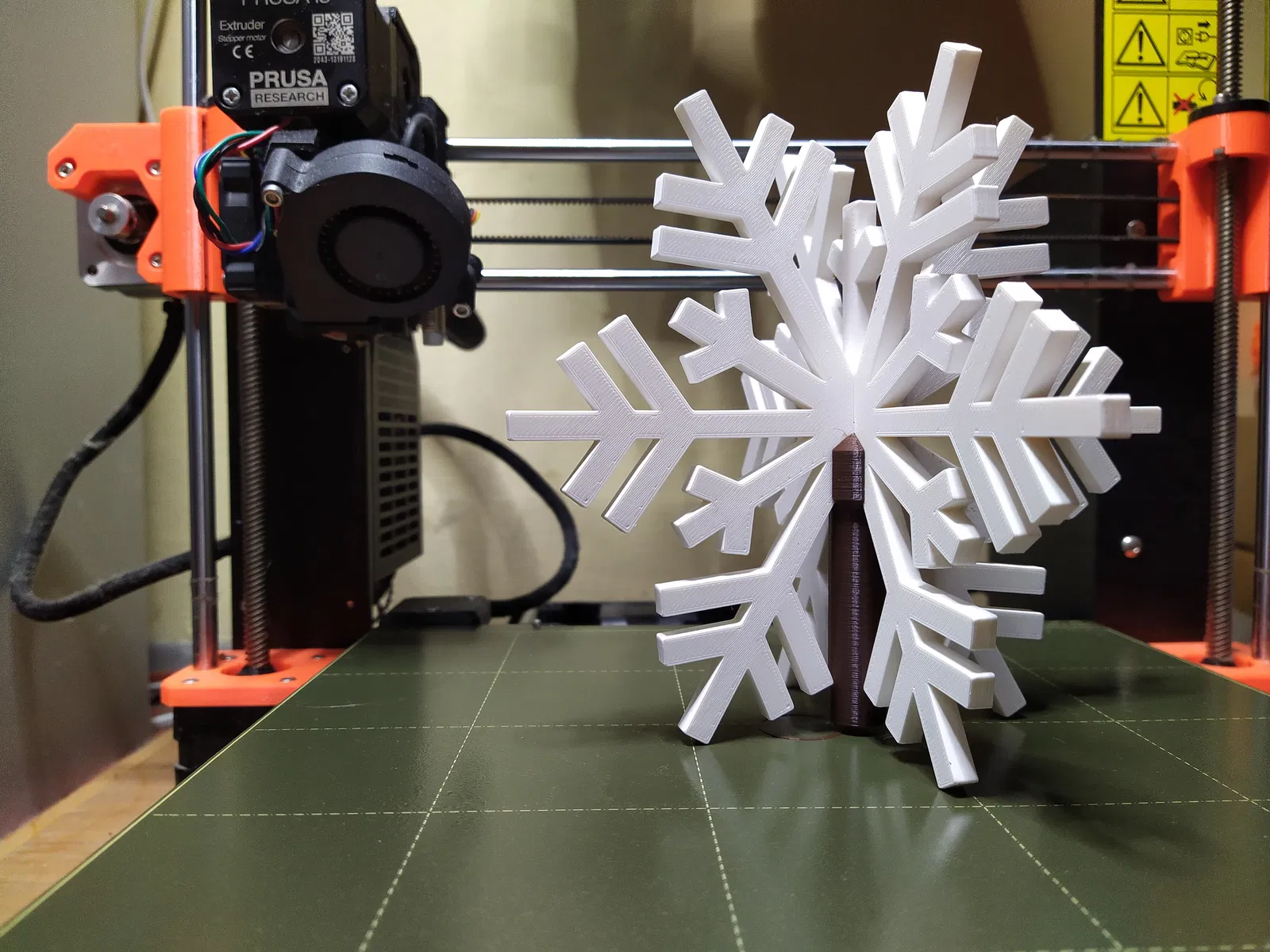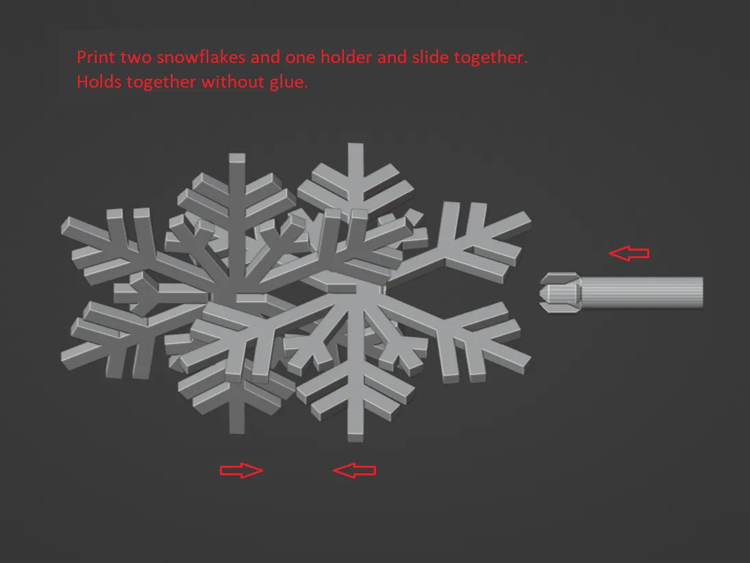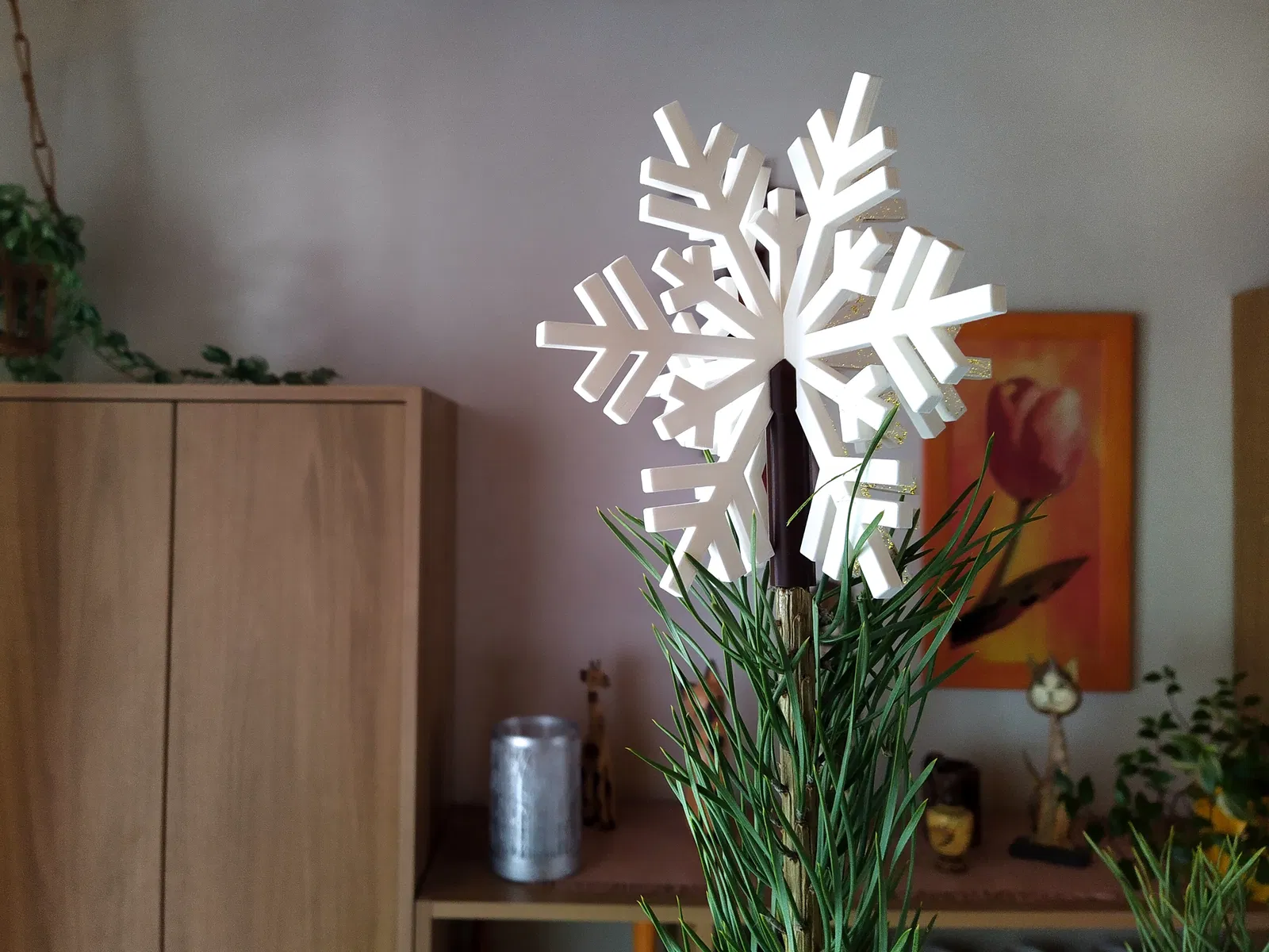 Mẫu chóp cây thông Noel hình bông tuyết đơn giản, kích thước lớn (160 mm). Chỉ cần in hai bông tuyết và một đế rồi ghép lại là xong, không cần keo dán. Phù hợp để trang trí nhà cửa mùa Giáng Sinh, mùa đông.