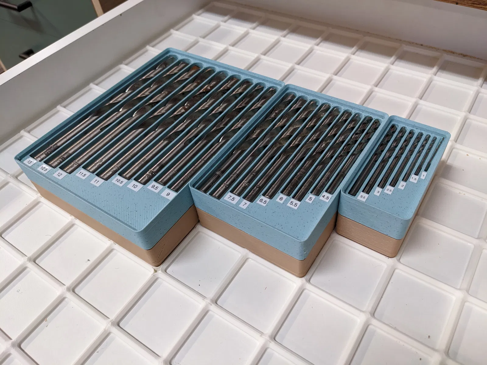 Bộ giữ mũi khoan Gridfinity này được thiết kế để chứa trọn bộ mũi khoan metric tiêu chuẩn từ 1mm đến 13mm. Sản phẩm gồm ba phần: nhỏ, vừa và lớn. Có cả phiên bản có và không có lỗ nam châm để bạn lựa chọn.