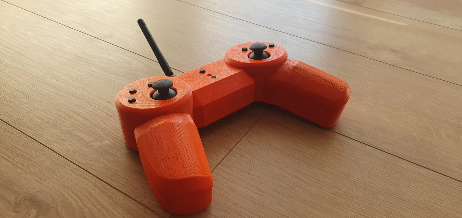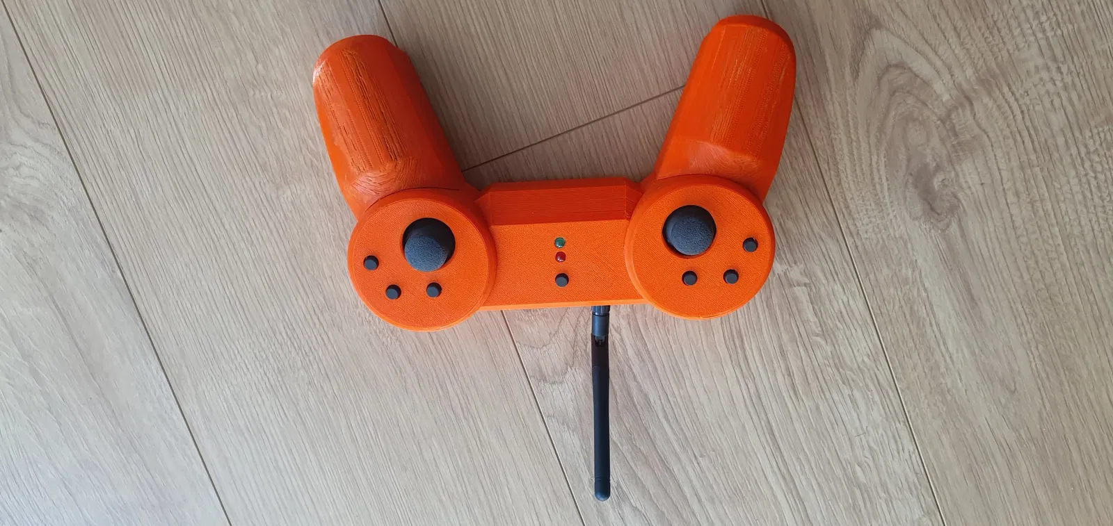 Dữ liệu nhận được từ xa là mảng số nguyên 12 chữ số. Mỗi số tương ứng với một nút (hoặc trục joystick) cụ thể. Một nút ở phần giữa sẽ đặt lại arduino khi được nhấn. Đèn LED trên cùng sáng khi có vấn đề kết nối với mô-đun radio. Đèn LED dưới sáng lên khi dữ liệu đã được gửi và nhận thành công bởi bộ thu.