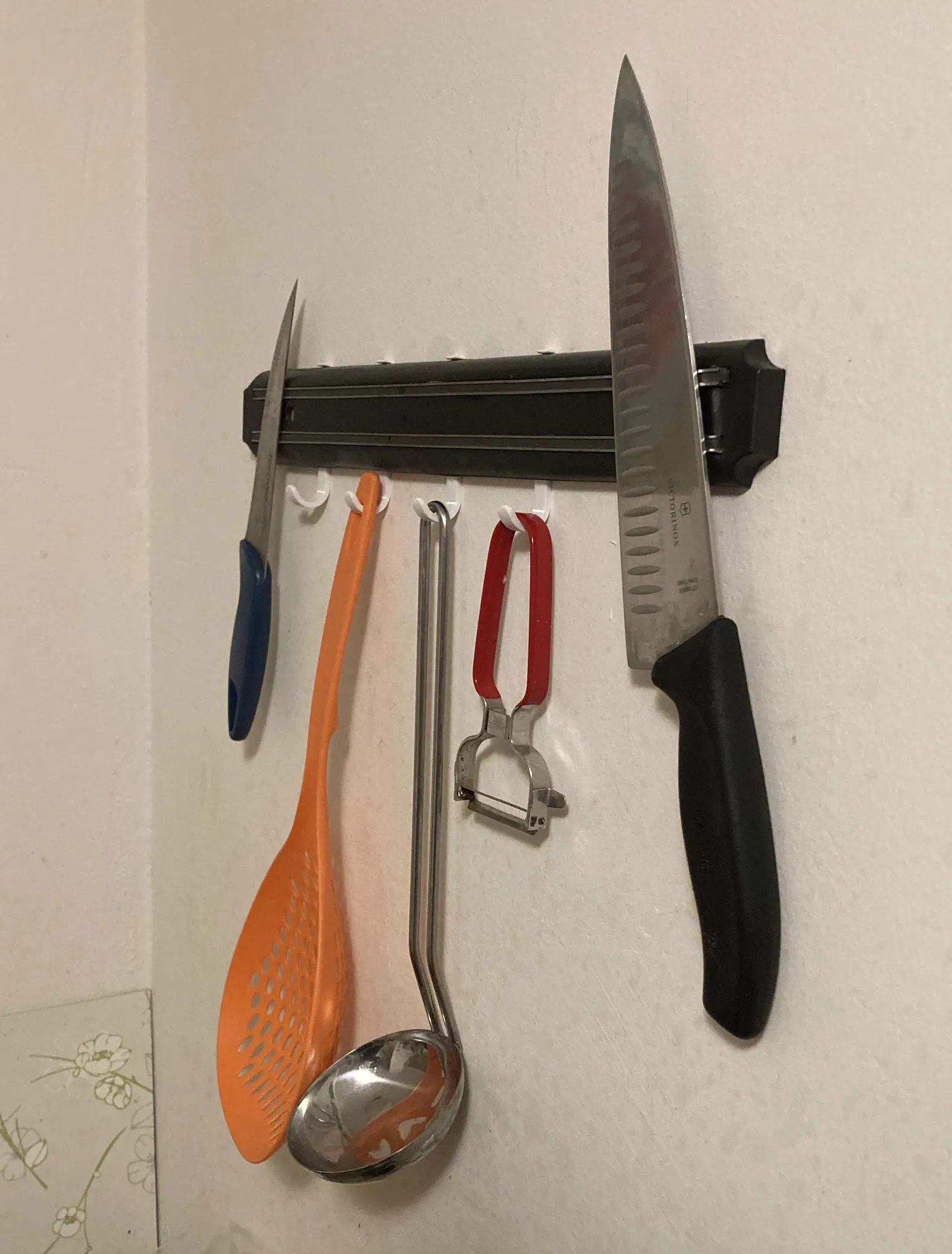 Vẫn đang ở tạm trong một nơi nhỏ không thể khoan hay đóng đinh gì hết á, mà không phải cái nào cũng hít được nam châm nên tui thêm mấy cái móc này cho cái giá dao nam châm sẵn có.