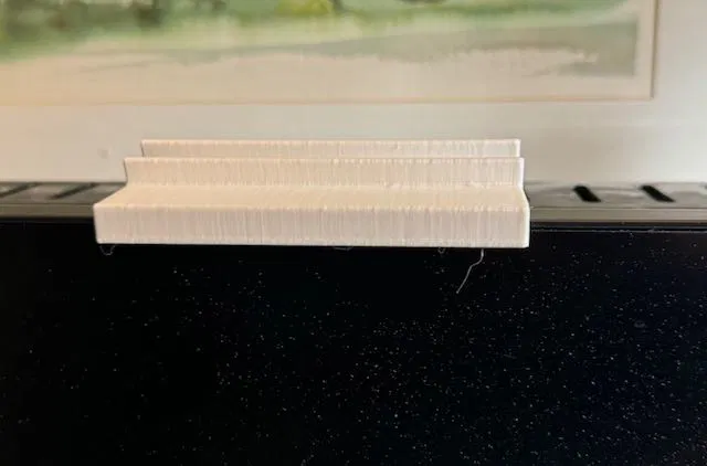 Kẹp đơn giản để giữ iPhone trên đỉnh màn hình. Kẹp này dành cho màn hình dày khoảng ~ 20 mm và có cạnh trước thẳng đứng. Tôi đã thêm 3 hình chữ nhật nhô lên 1 mm vào khe cắm để iPhone không bị cấn vào các nút cạnh bên.