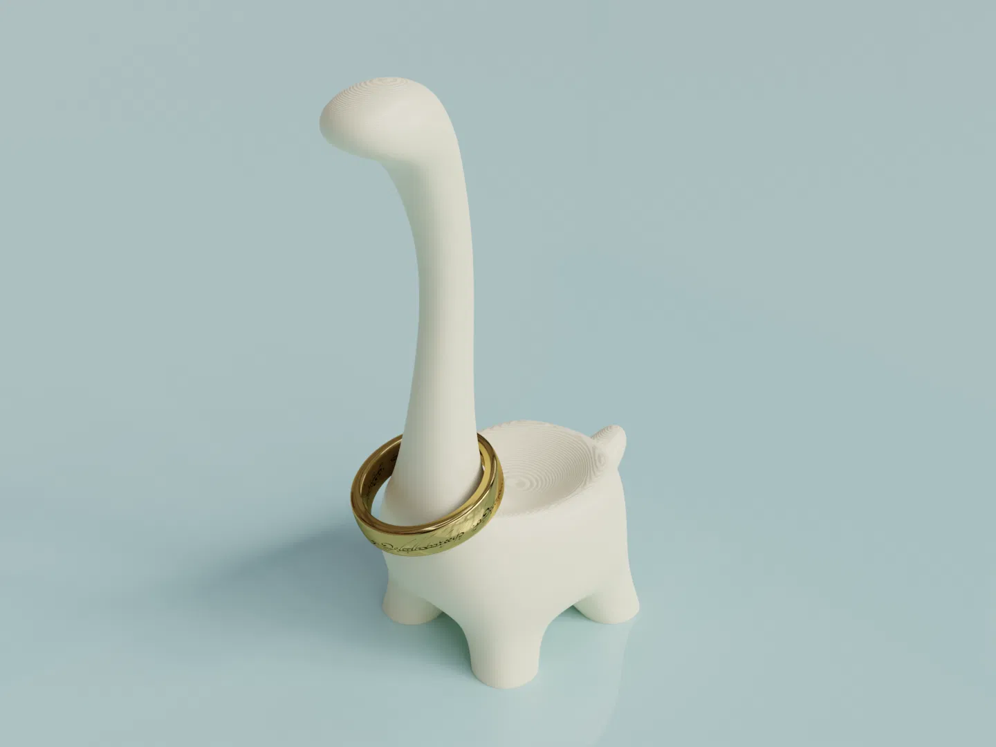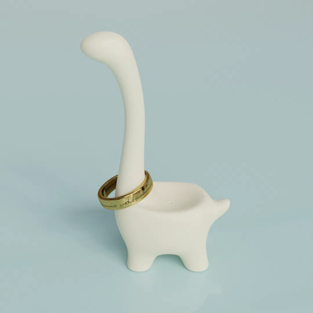 Ringosaurus, giá đỡ nhẫn khủng long dễ thương, sẽ canh giữ nhẫn và bông tai của bạn với vẻ sang trọng từ thời tiền sử. Nó có thể giữ nhẫn trên cổ và đuôi, còn bông tai thì để trên lưng. In nguyên khối không cần giá đỡ.
