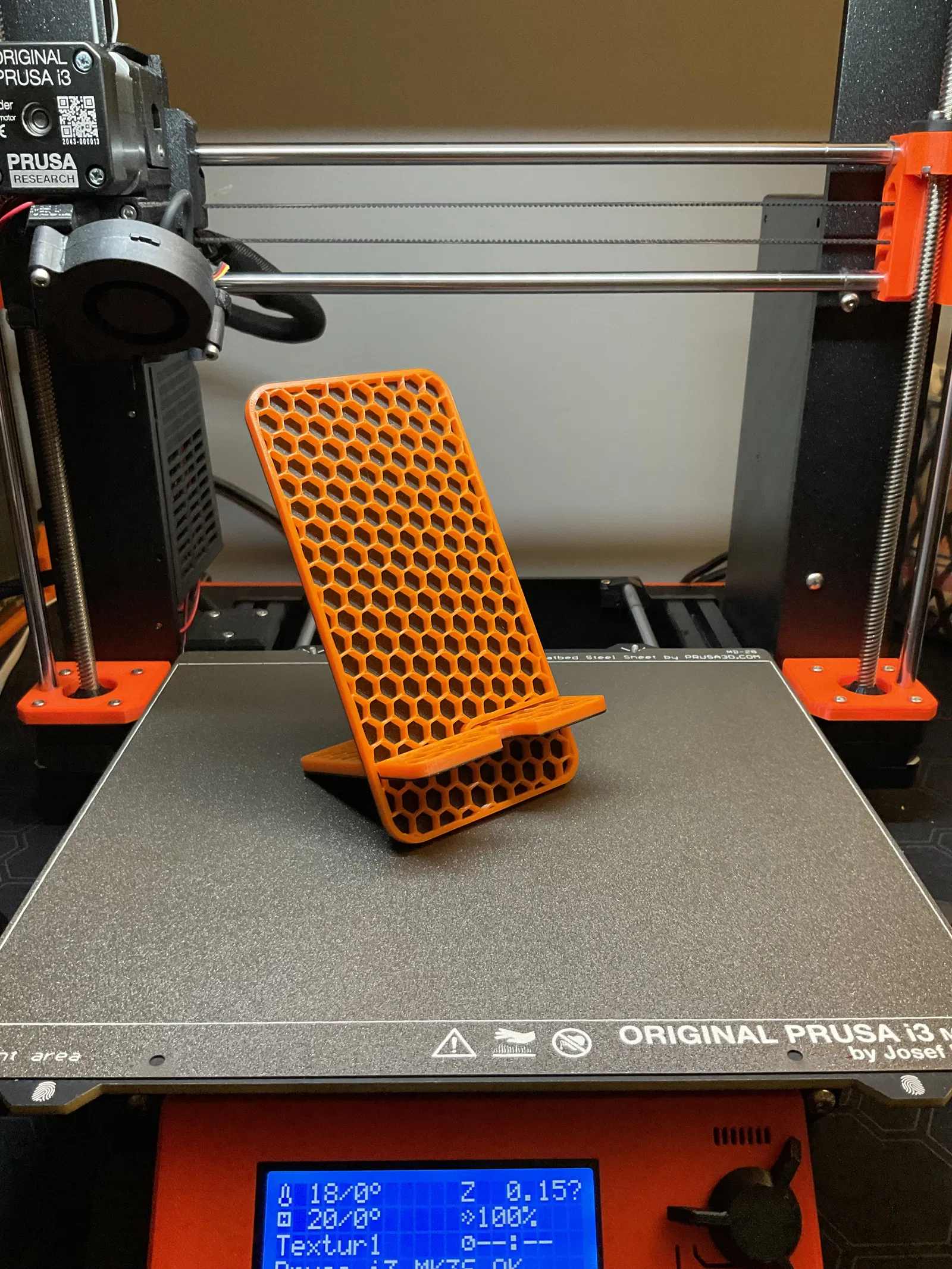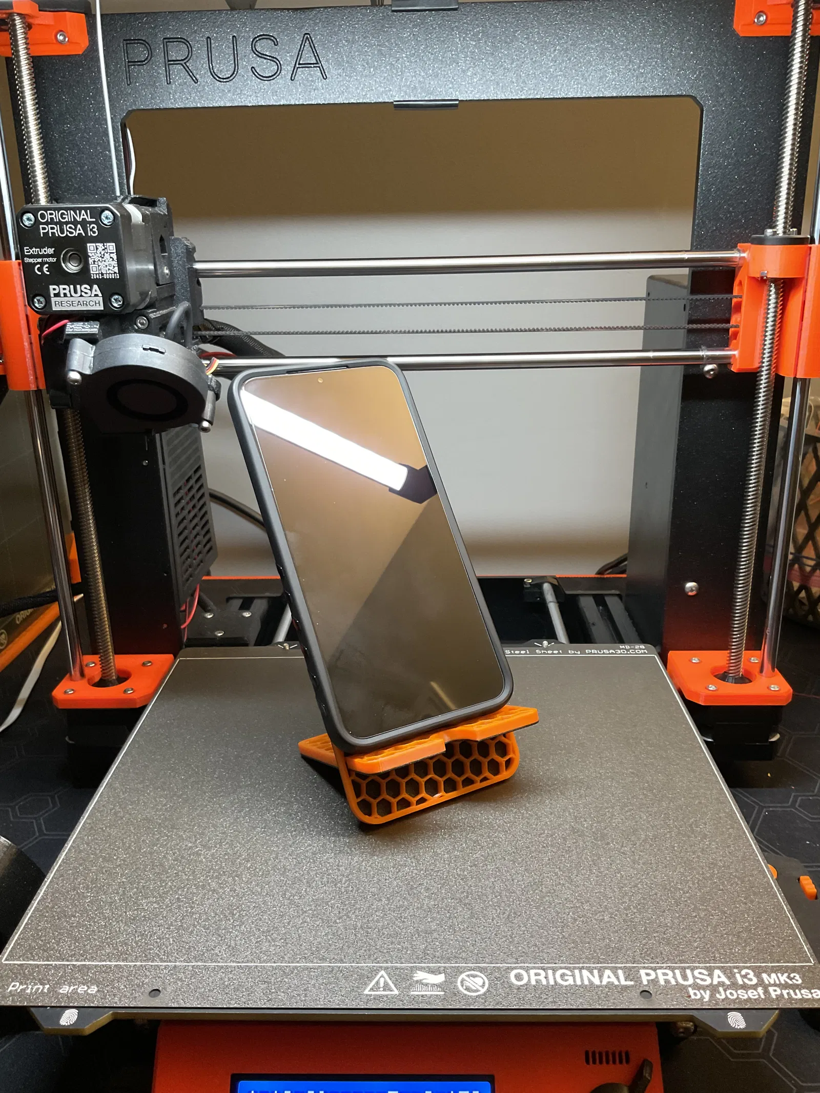 Mẫu chân đế giữ điện thoại đơn giản, dễ in. Bạn có thể in bằng PETG hoặc PLA. Thử nghiệm các loại ruột khác nhau và tùy chỉnh màu sắc để tạo điểm nhấn độc đáo cho sản phẩm của mình. Mẫu này rất hợp để khoe phần ruột bên trong với cấu trúc tổ ong ấn tượng.