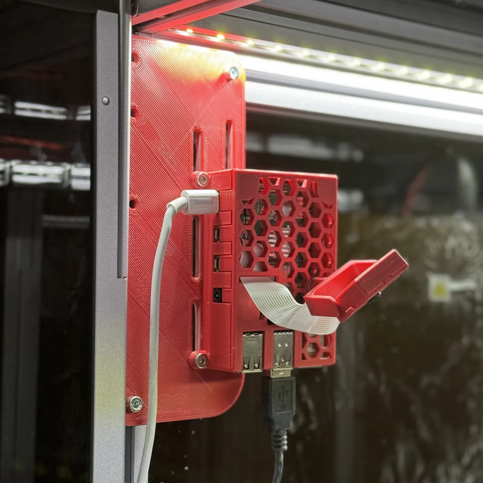Tấm đế này dùng để gắn thêm các tùy chọn cấu hình bên trong vỏ máy Snapmaker 2 A350, tận dụng các lỗ vít M4 có sẵn để cố định vỏ Raspberry Pi với Octopi. In bằng chất liệu ASA đỏ.