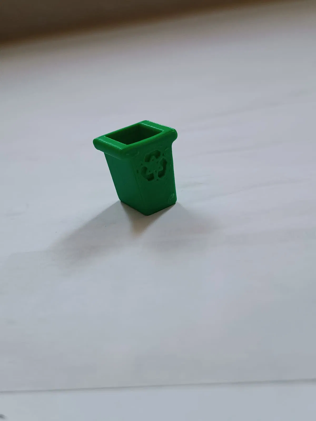 Một mô hình thùng rác nhỏ tái chế, có thể in mà không cần trụ đỡ. Thích hợp làm đồ trang trí hoặc phụ kiện trong các mô hình, biểu tượng tái chế có thể nhìn thấy rõ tùy thuộc vào kích thước và chất lượng in.