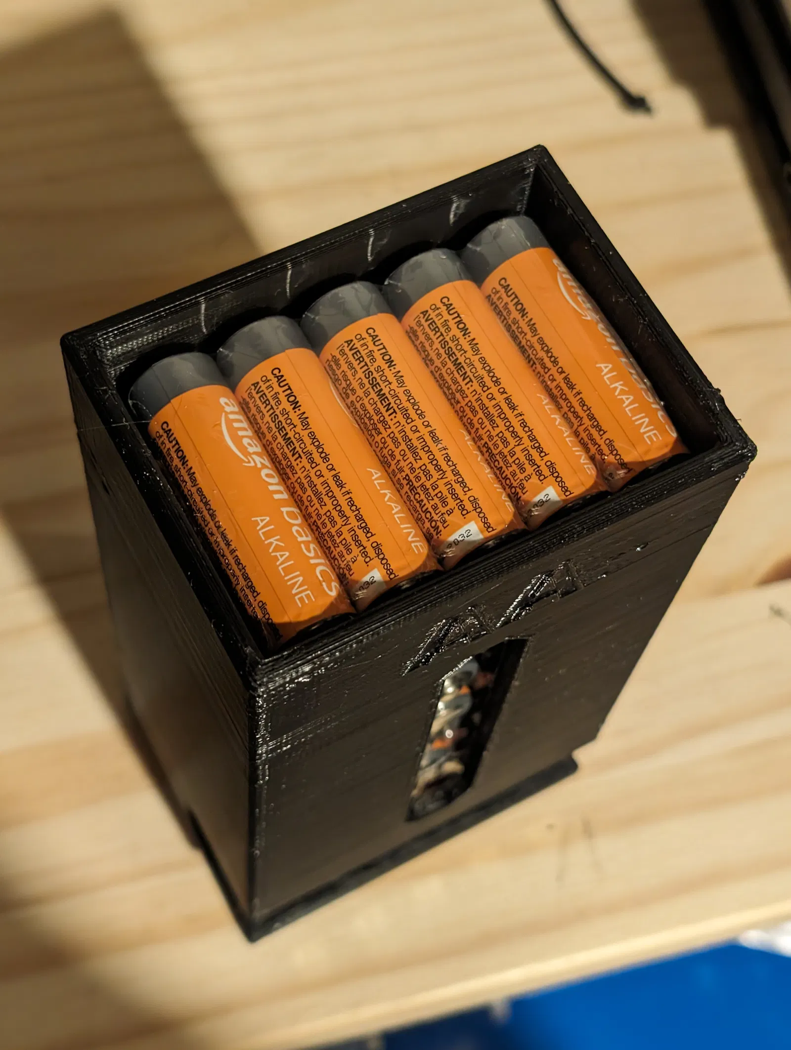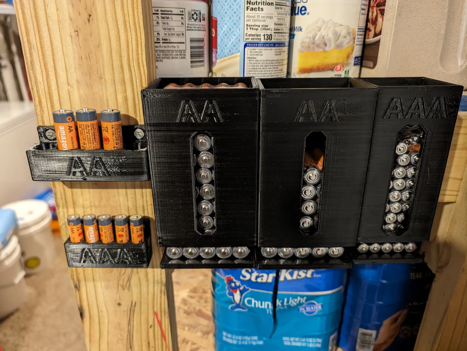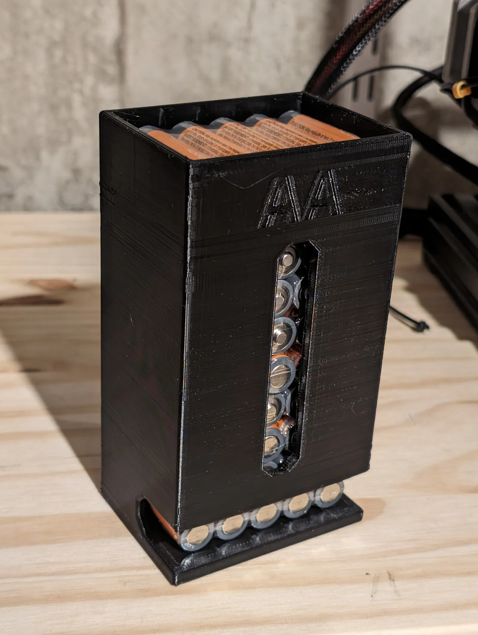 Hộp đựng pin AA treo tường, được thiết kế để chứa pin 5 viên của Amazon. Có thể chứa tổng cộng 50 viên pin, có thể treo trên ván 2x4. Có mẫu đựng pin rời khác. In với ít vật liệu hỗ trợ.