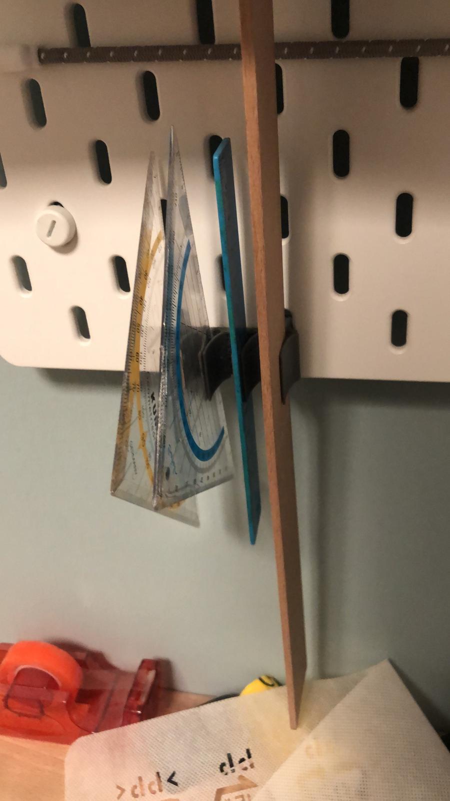 Có thể treo trên bảng lỗ IKEA Skadis để giữ thước kẻ. Có thể giữ thước kẻ trên bảng thông báo lỗ IKEA Skadis.