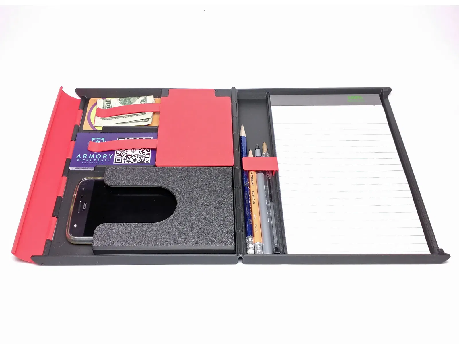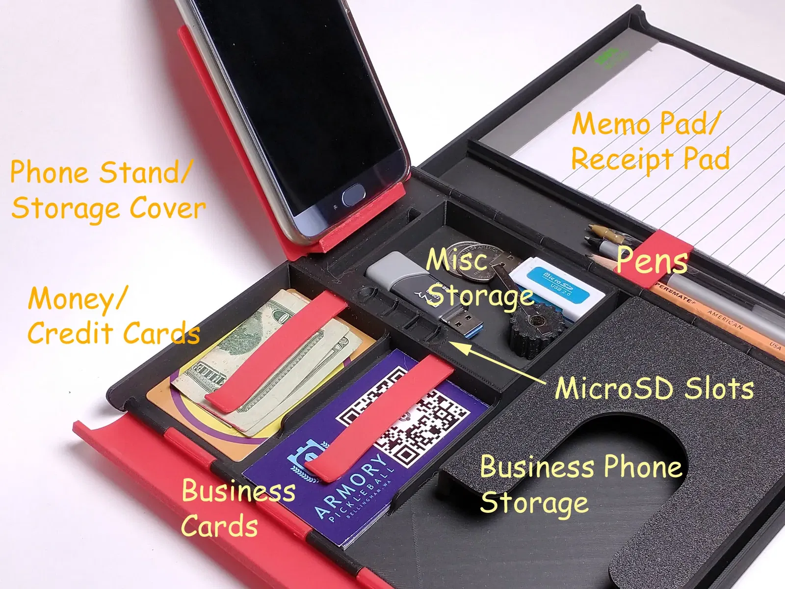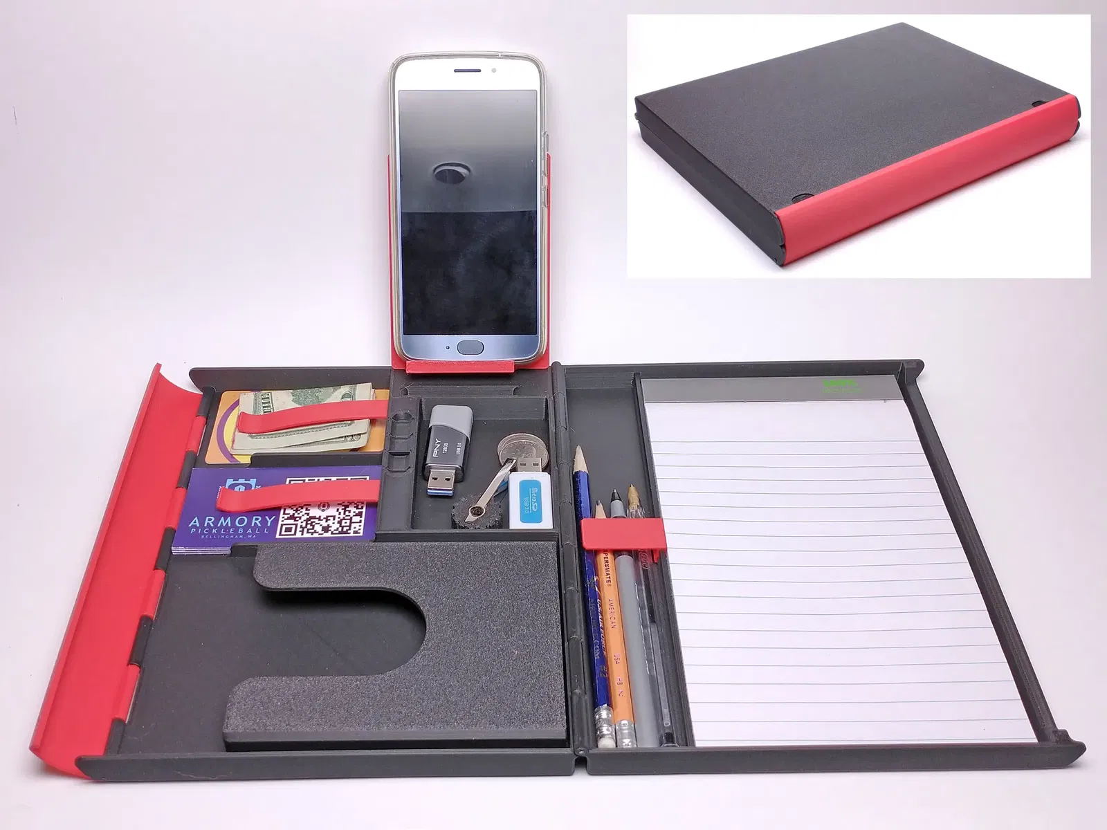 Để sử dụng, đóng lại bộ tổ chức và nhấn dọc theo chốt để gài đầu móc qua rãnh bên phải. Kéo mép của chốt ra để mở lại. Lưu ý rằng giá đỡ điện thoại hoạt động như một nắp cho thùng lưu trữ linh tinh khi đóng lại, nhưng có thể được kéo ra và nhét vào khe nghiêng khi sử dụng như một giá đỡ điện thoại.